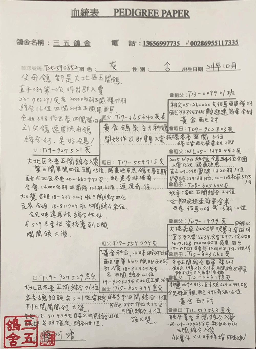 (2)超級種母T83-29914 斑♀"印鈔機",本身入賞72年冬季四關綜合亞軍,印鈔機總共與7羽公鴿配對,每羽的配對直子都得到冠軍,其直系下代翔完五關也超過百羽以上。