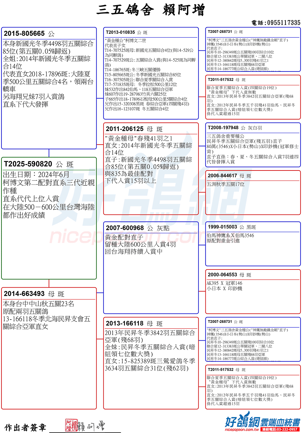 三五鴿舍賴阿增憑藉著已適應台灣氣候又易於融合的本土鴿系,以這四大支柱為基礎,四大鴿系彼此融合性強,兼具速度及適應惡劣氣候的特性,多年來不混入另外的鴿系以自己的紀錄鴿配紀錄鴿,實戰紀錄加上彼此融合的血系早已自成一格,三五鴿系才得以不斷創造佳績的。