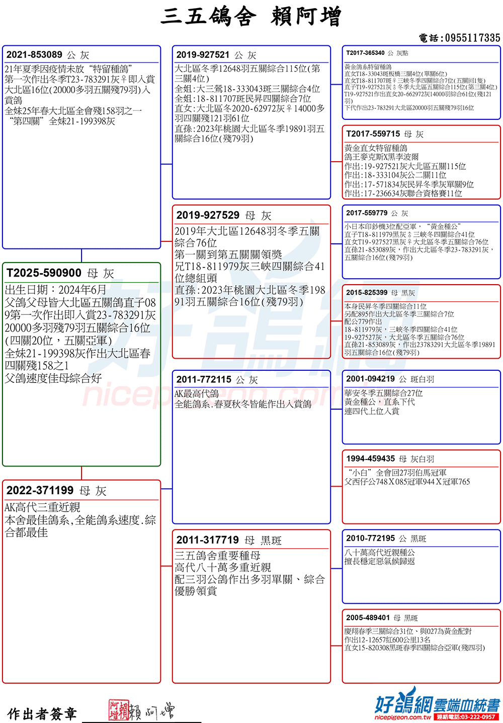 三五鴿舍賴阿增憑藉著已適應台灣氣候又易於融合的本土鴿系,以這四大支柱為基礎,四大鴿系彼此融合性強,兼具速度及適應惡劣氣候的特性,多年來不混入另外的鴿系以自己的紀錄鴿配紀錄鴿,實戰紀錄加上彼此融合的血系早已自成一格,三五鴿系才得以不斷創造佳績的。
