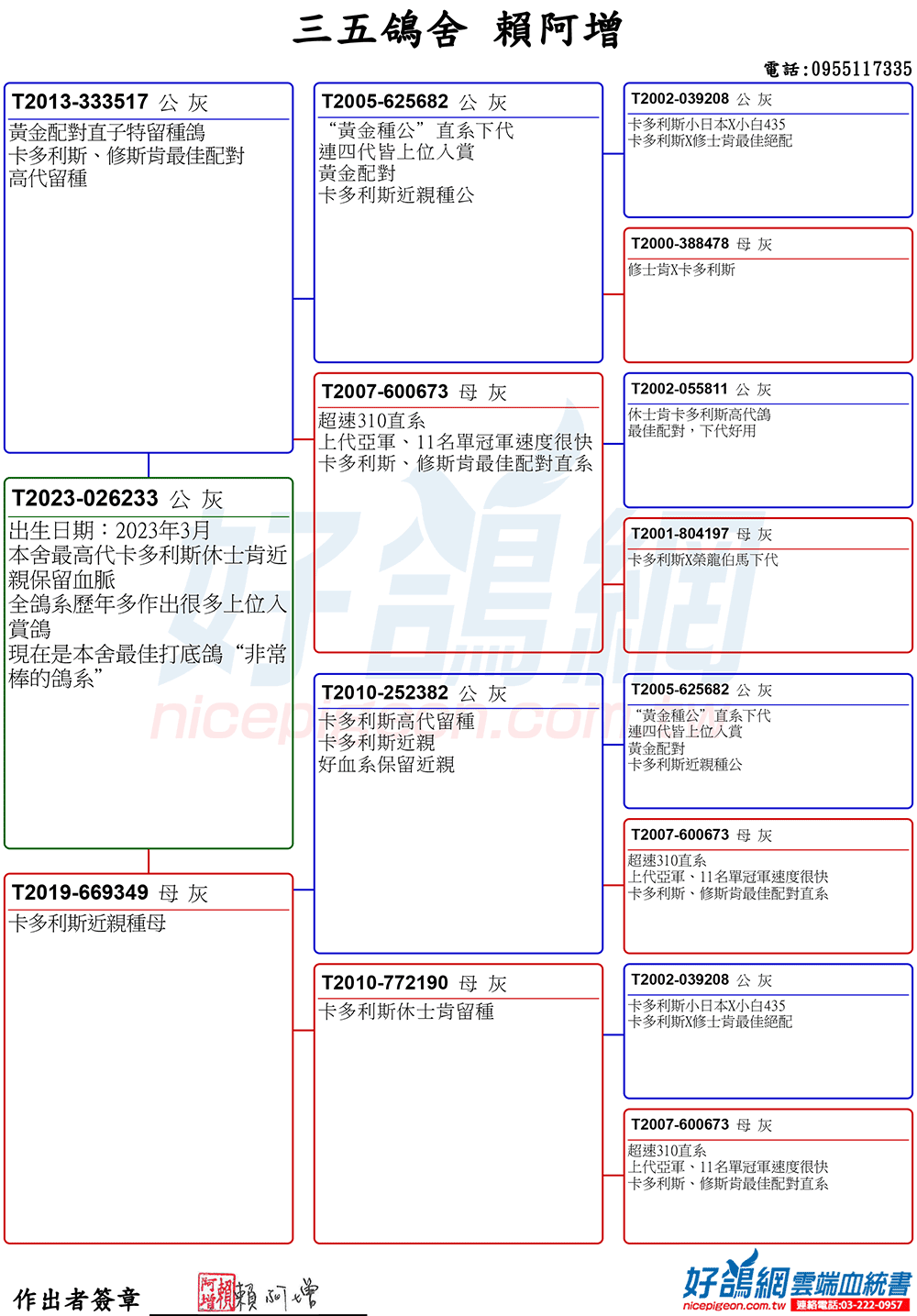 三五鴿舍賴阿增憑藉著已適應台灣氣候又易於融合的本土鴿系,以這四大支柱為基礎,四大鴿系彼此融合性強,兼具速度及適應惡劣氣候的特性,多年來不混入另外的鴿系以自己的紀錄鴿配紀錄鴿,實戰紀錄加上彼此融合的血系早已自成一格,三五鴿系才得以不斷創造佳績的。