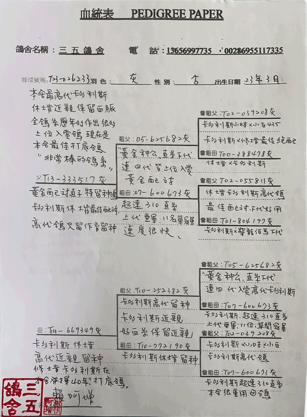 (3)"伯馬阿密魯" 633"T88-29633斑♂。本身入賞72年冬季五關綜合亞軍(全會殘3羽、獨佔2羽),其直子、女也入賞13羽之多,直系下代入賞綜合成績眾多,也都遺傳適應台灣獨特惡劣氣候的特性及本身的歸巢韌性及綜合性。