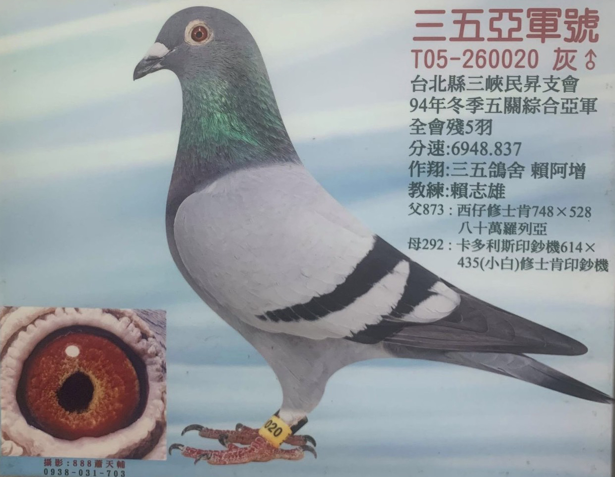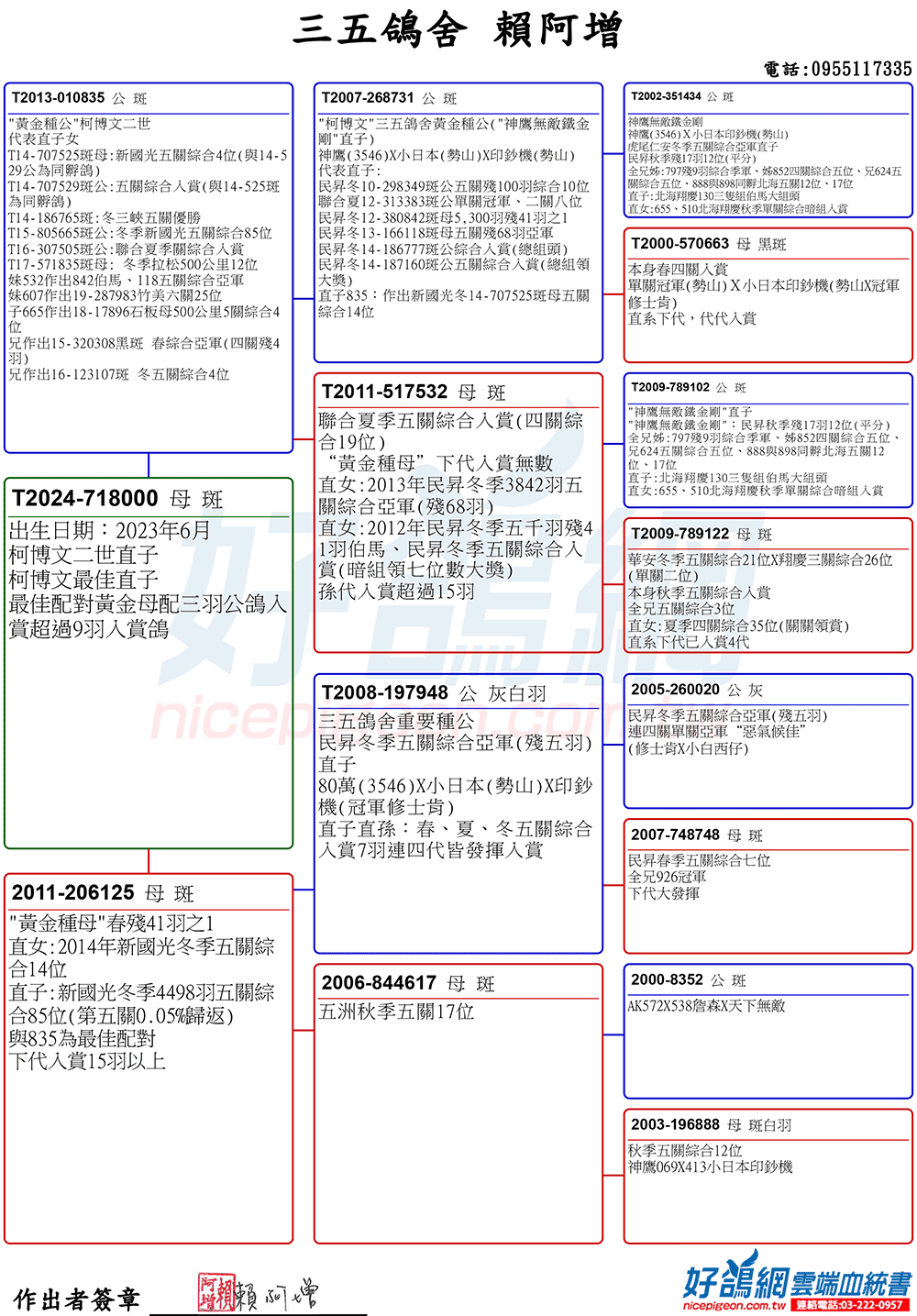 (2)超級種母T83-29914 斑♀"印鈔機",本身入賞72年冬季四關綜合亞軍,印鈔機總共與7羽公鴿配對,每羽的配對直子都得到冠軍,其直系下代翔完五關也超過百羽以上。