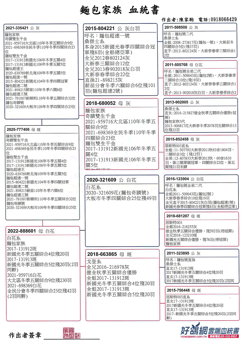 陳家駒表示,麵包家族在賽場上不論是綜合或是單關成績都能有亮眼表現,須歸功於原本優質的好鴿底與近親作育的方式。多年以來,透過旁系(叔、甥舅)互配近親作出為主,作出後選手鴿或是特留種鴿皆宜。我們可以從麵包家族的成績印證近親育方式是已經成為一套勝利方程式。所以才能在低歸返成數能名列前茅、在好天氣又能單關入賞的好表現!