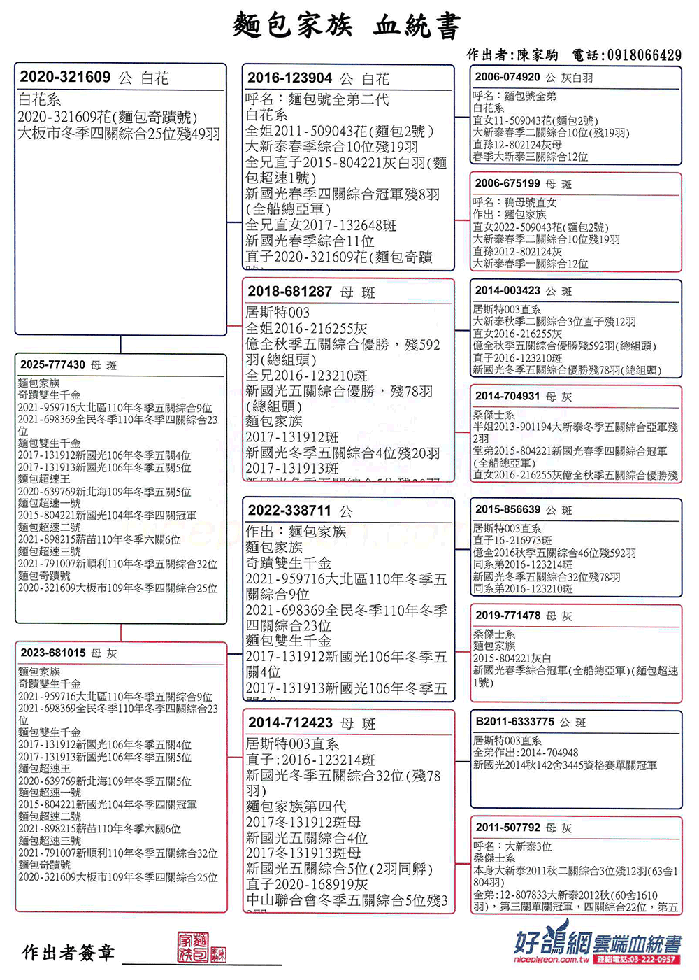 陳家駒表示,麵包家族在賽場上不論是綜合或是單關成績都能有亮眼表現,須歸功於原本優質的好鴿底與近親作育的方式。多年以來,透過旁系(叔、甥舅)互配近親作出為主,作出後選手鴿或是特留種鴿皆宜。我們可以從麵包家族的成績印證近親育方式是已經成為一套勝利方程式。所以才能在低歸返成數能名列前茅、在好天氣又能單關入賞的好表現!