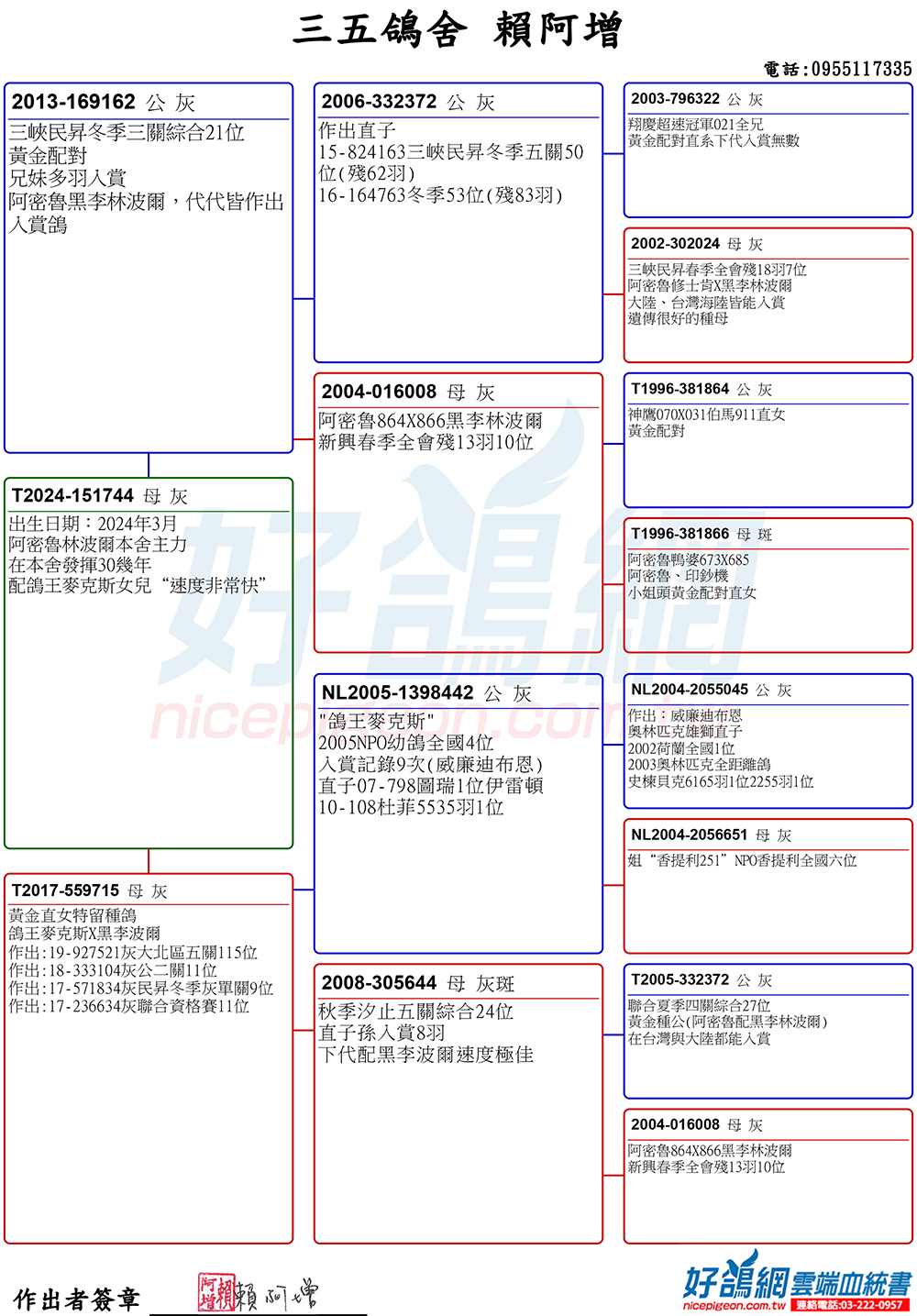 三五鴿舍賴阿增憑藉著已適應台灣氣候又易於融合的本土鴿系,以這四大支柱為基礎,四大鴿系彼此融合性強,兼具速度及適應惡劣氣候的特性,多年來不混入另外的鴿系以自己的紀錄鴿配紀錄鴿,實戰紀錄加上彼此融合的血系早已自成一格,三五鴿系才得以不斷創造佳績的。