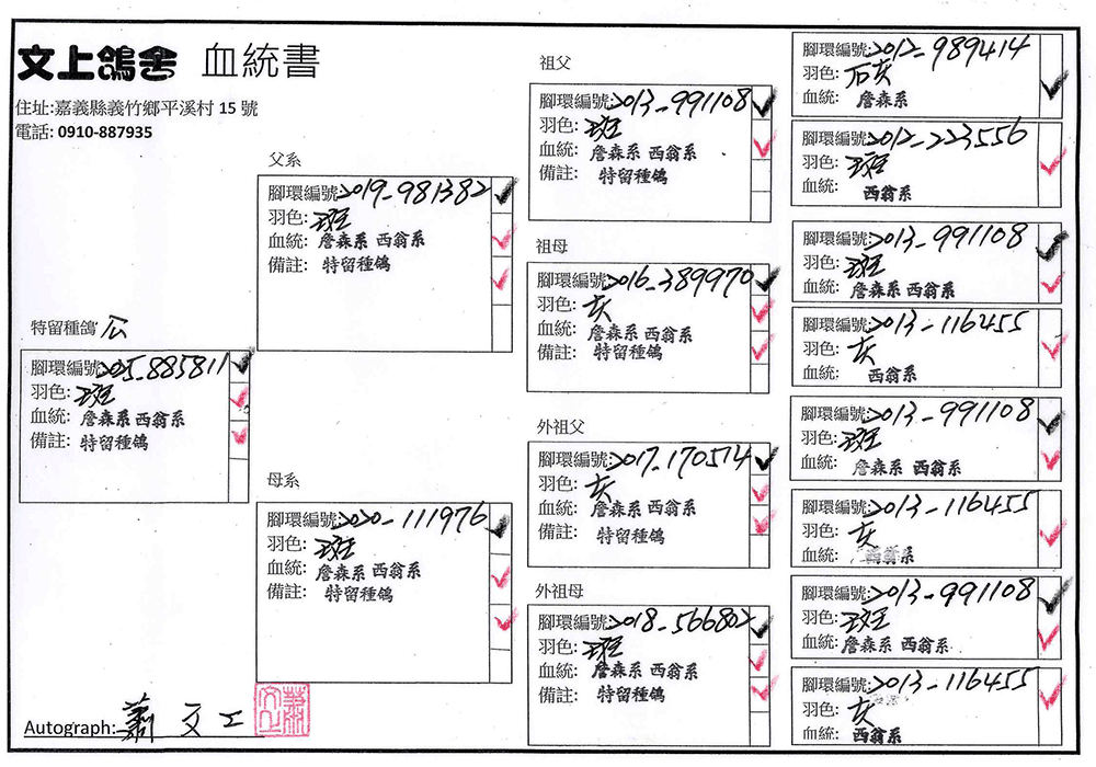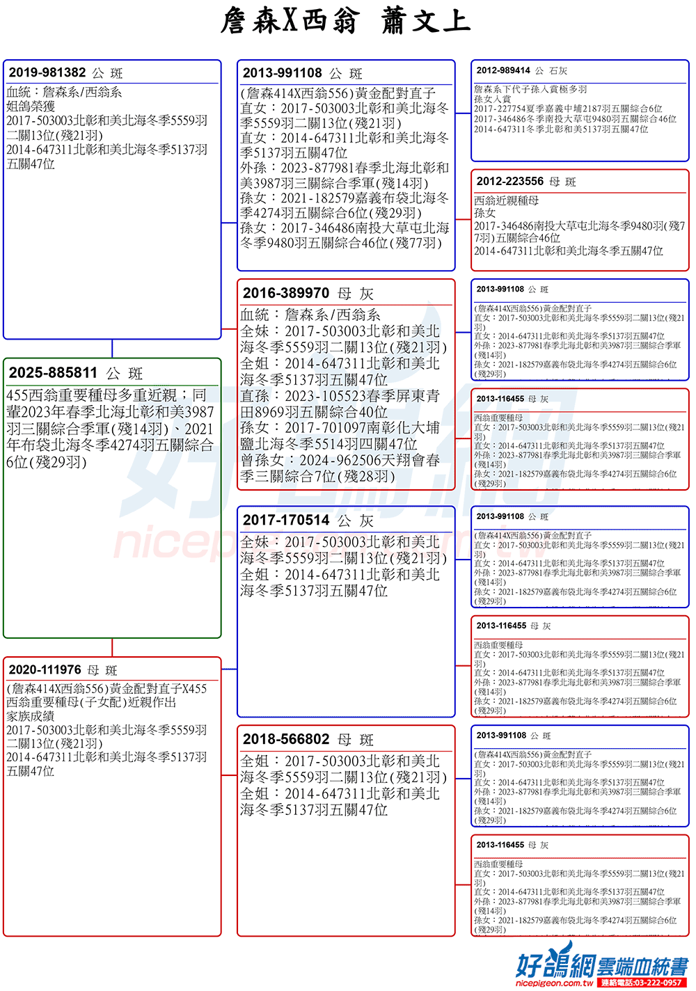 455西翁重要種母多重近親;同輩2023年春季北海北彰和美3987羽三關綜合季軍(殘14羽)、2021年布袋北海冬季4274羽五關綜合6位(殘29羽)