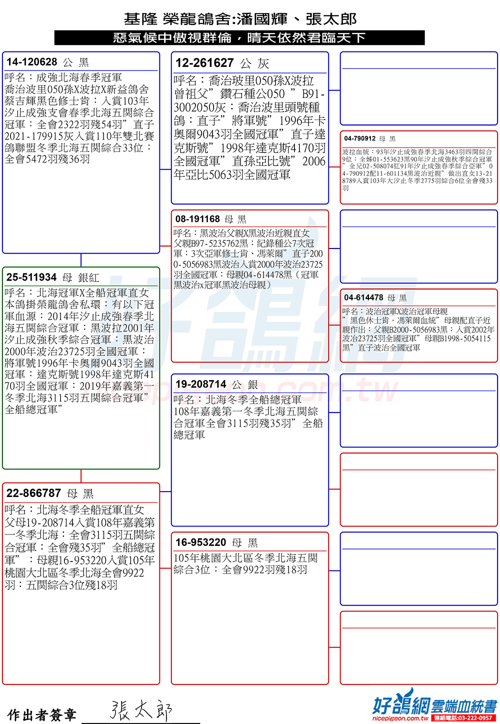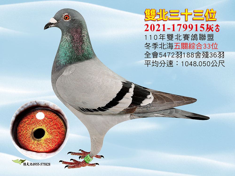 2023年春季北海宜蘭聯合會全會7165羽殘34羽,由基隆榮龍鴿舍潘國輝.張太郎作出23-762818灰母(使翔:邱宏宜,教練:陳志翔),入賞三關綜合14位。