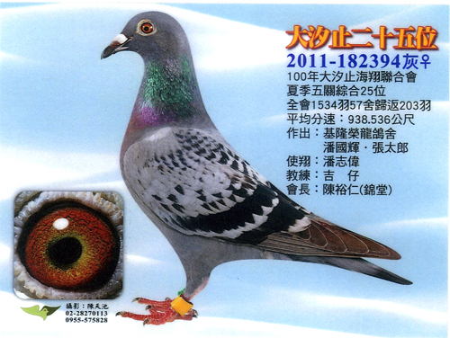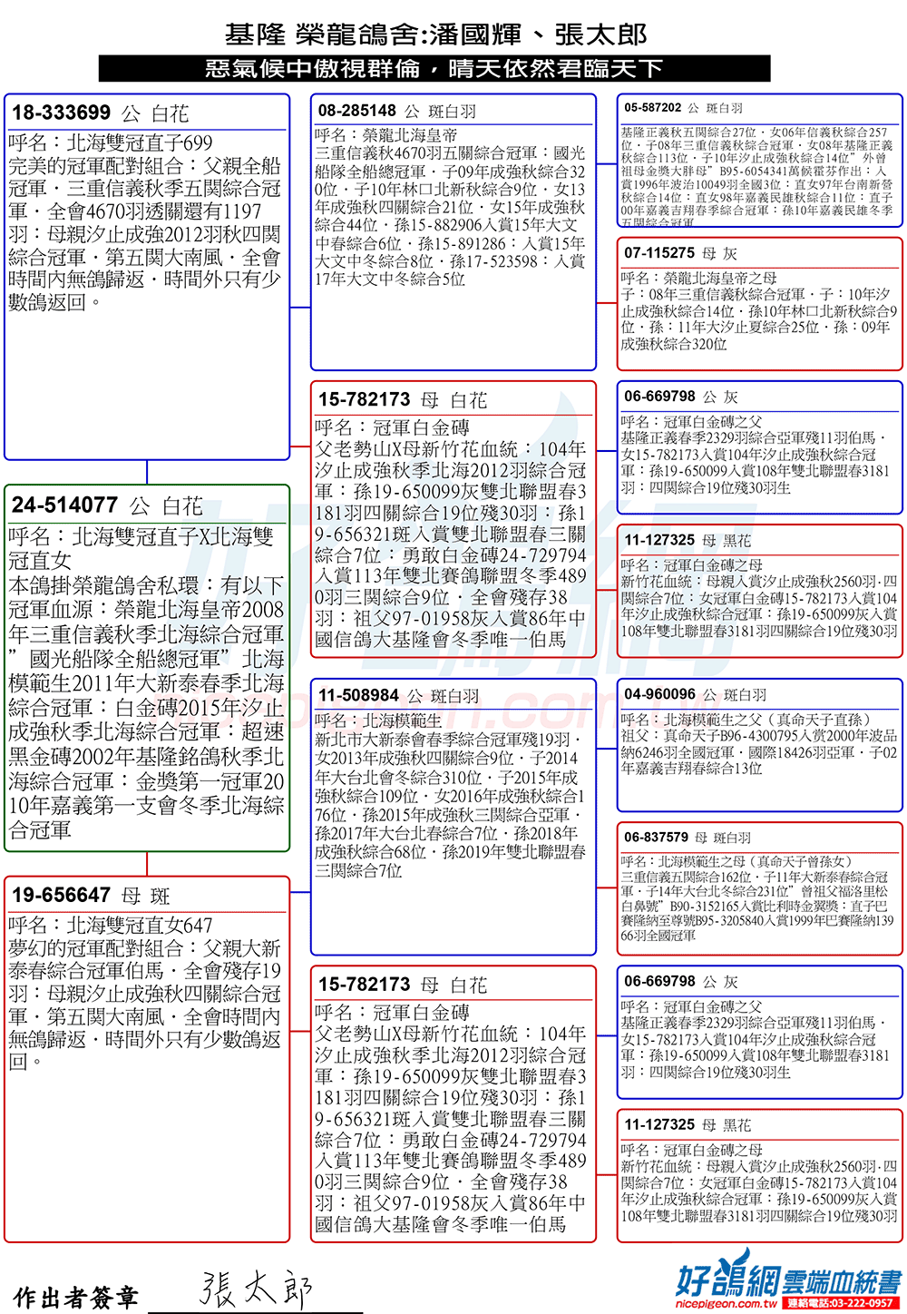 2023年春季北海宜蘭聯合會全會7165羽殘34羽,由基隆榮龍鴿舍潘國輝.張太郎作出23-762818灰母(使翔:邱宏宜,教練:陳志翔),入賞三關綜合14位。