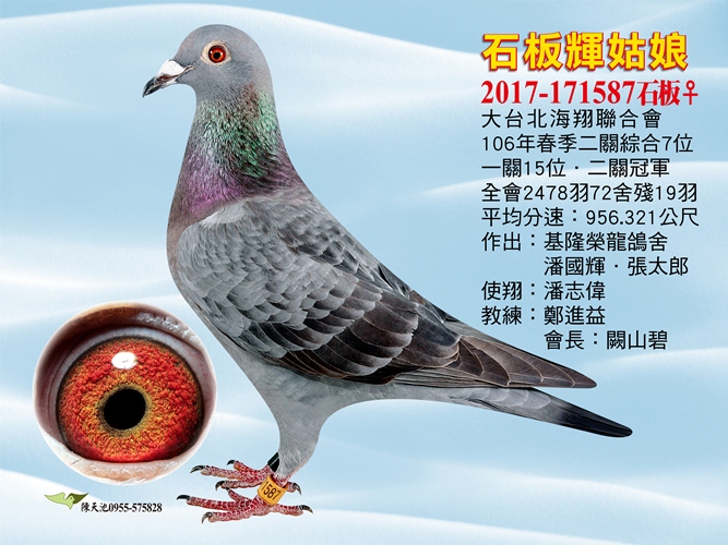 ▲母鴿:17-171587石板輝姑娘(春季大台北2478羽二關綜合7位(一關15位、二關冠軍)