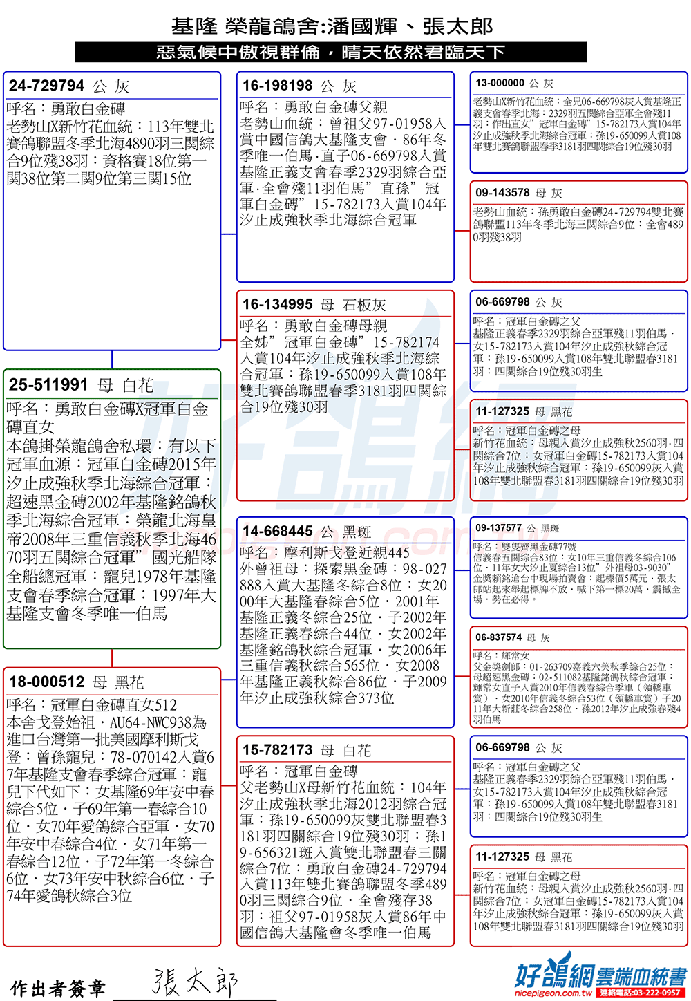 2023年春季北海宜蘭聯合會全會7165羽殘34羽,由基隆榮龍鴿舍潘國輝.張太郎作出23-762818灰母(使翔:邱宏宜,教練:陳志翔),入賞三關綜合14位。