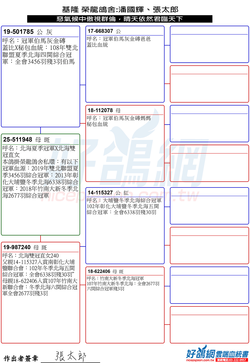 ▲父鴿:19-501785冠軍伯馬灰金磚