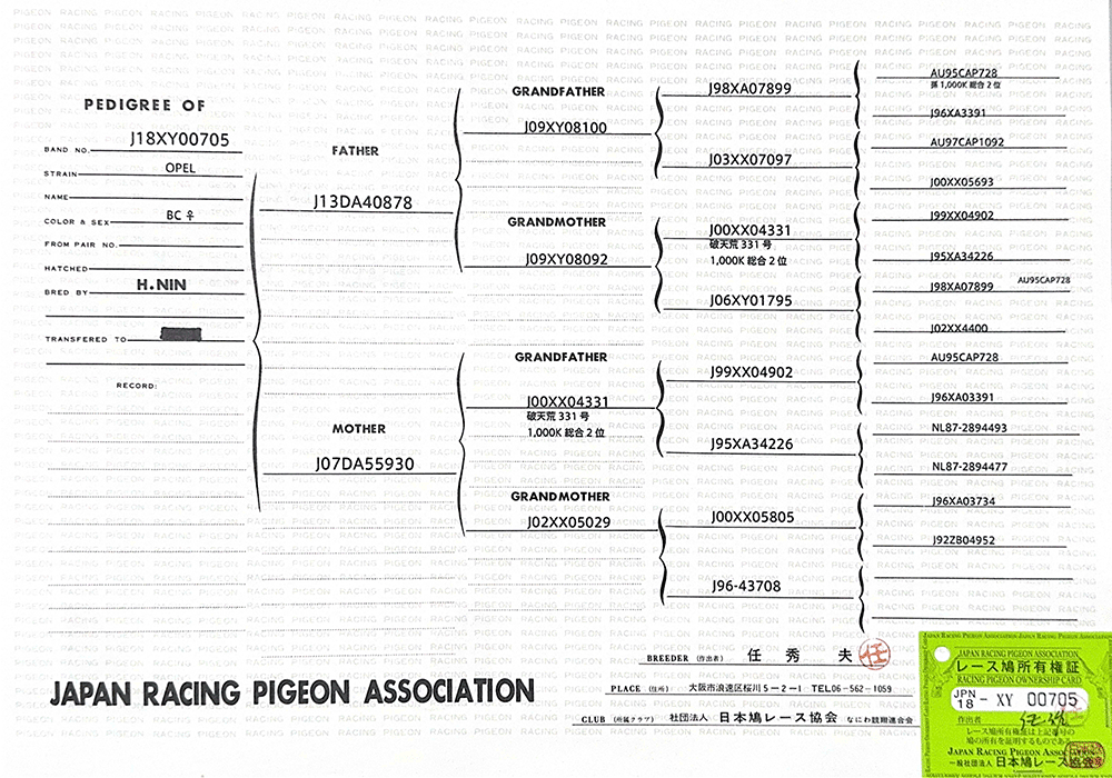 詹森的大名鴿019,B73-6736019,雄鴿。「019」是詹森兄弟自有史以來最為傑出的賽鴿,光是冠軍的記錄就高達18次之多,有的傳聞甚至是更多!