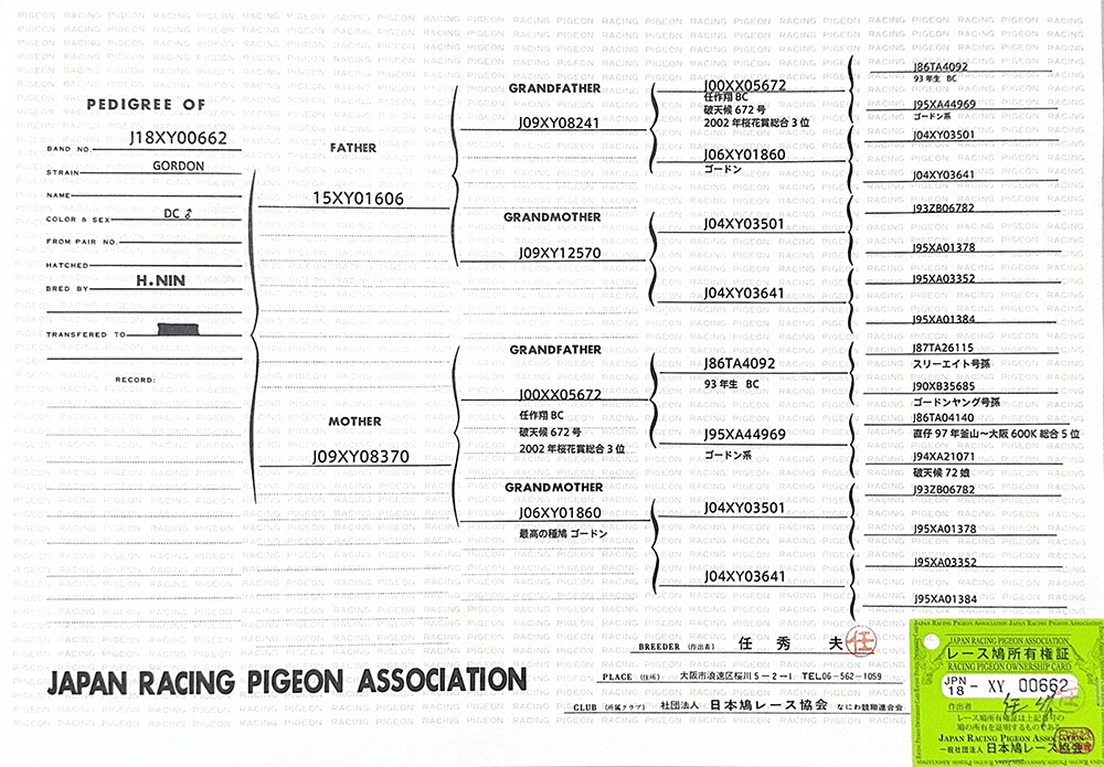 詹森的大名鴿019,B73-6736019,雄鴿。「019」是詹森兄弟自有史以來最為傑出的賽鴿,光是冠軍的記錄就高達18次之多,有的傳聞甚至是更多!