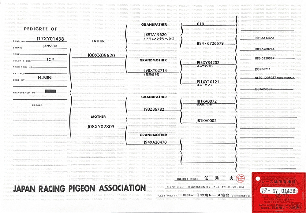 詹森的大名鴿019,B73-6736019,雄鴿。「019」是詹森兄弟自有史以來最為傑出的賽鴿,光是冠軍的記錄就高達18次之多,有的傳聞甚至是更多!