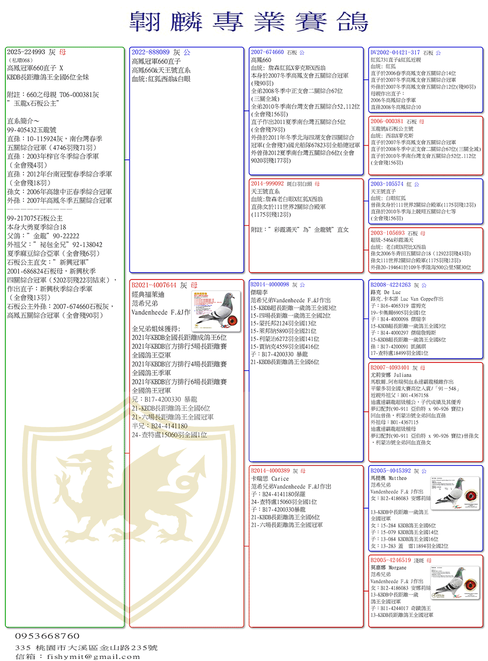 特別值得一提的是從2019年冬季首次寄翔8羽參賽新北市三重新順利分會即入賞五關綜合27位與48位,同年秋季寄翔3羽又入賞綜合61位,撲克組2 K 5位暗組多項獲獎。