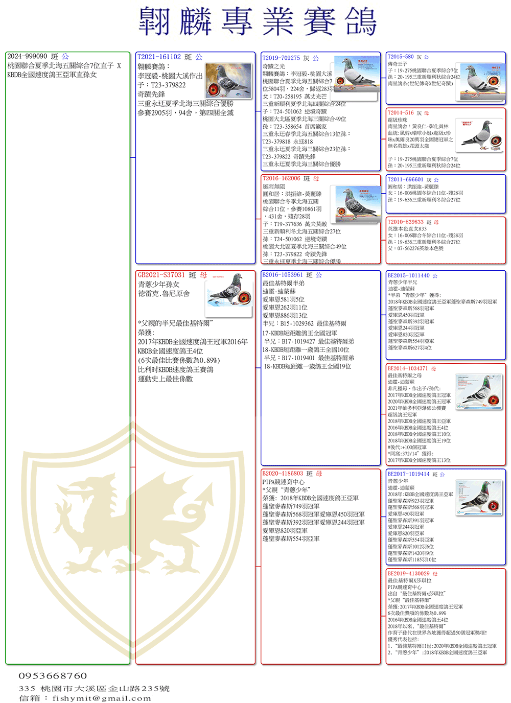 特別值得一提的是從2019年冬季首次寄翔8羽參賽新北市三重新順利分會即入賞五關綜合27位與48位,同年秋季寄翔3羽又入賞綜合61位,撲克組2 K 5位暗組多項獲獎。