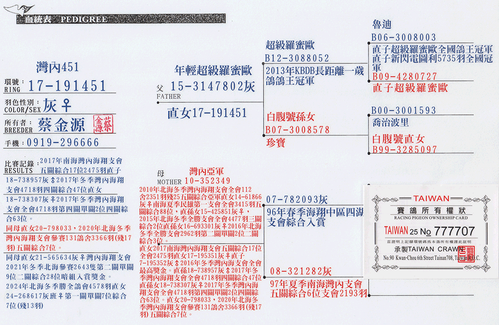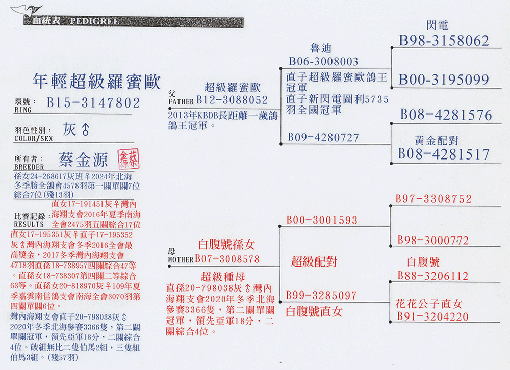 ▲父鴿、外祖父:B2015-3147802年輕超級羅密歐