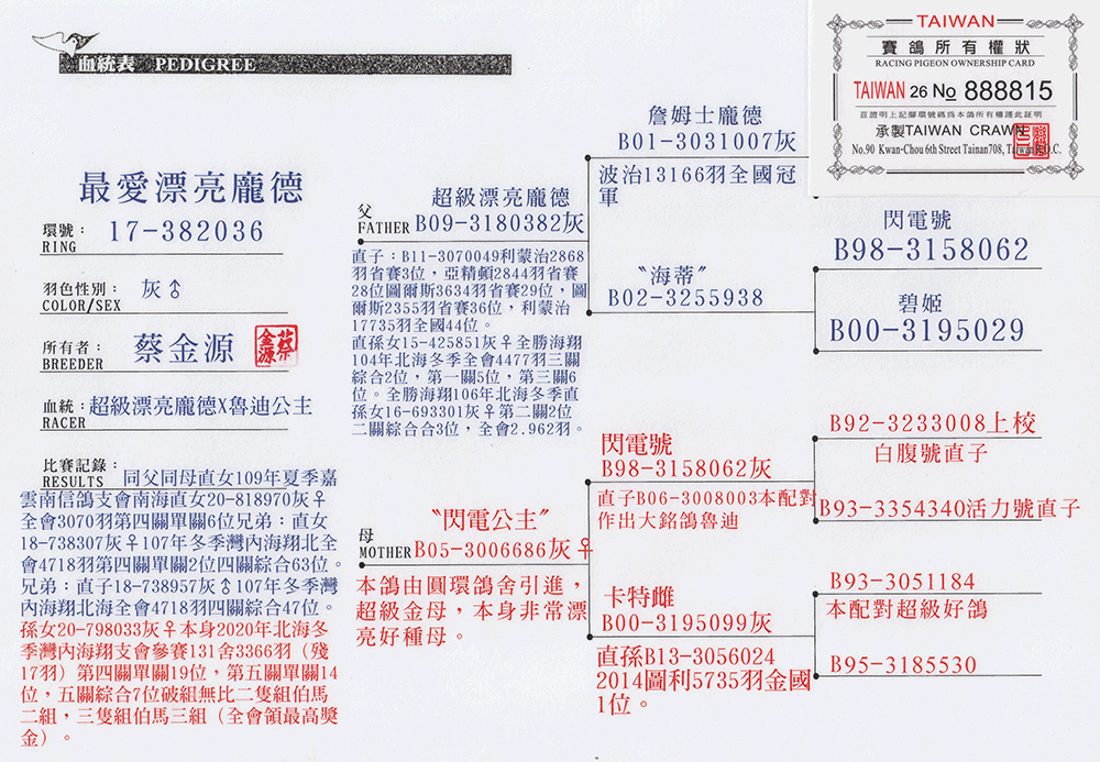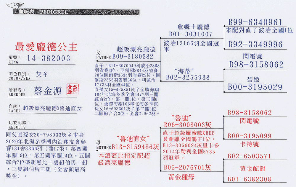 ▲外曾曾祖母:B00-3195029“碧姬”波提爾全省2766羽亞軍,查特魯全省4498羽7位