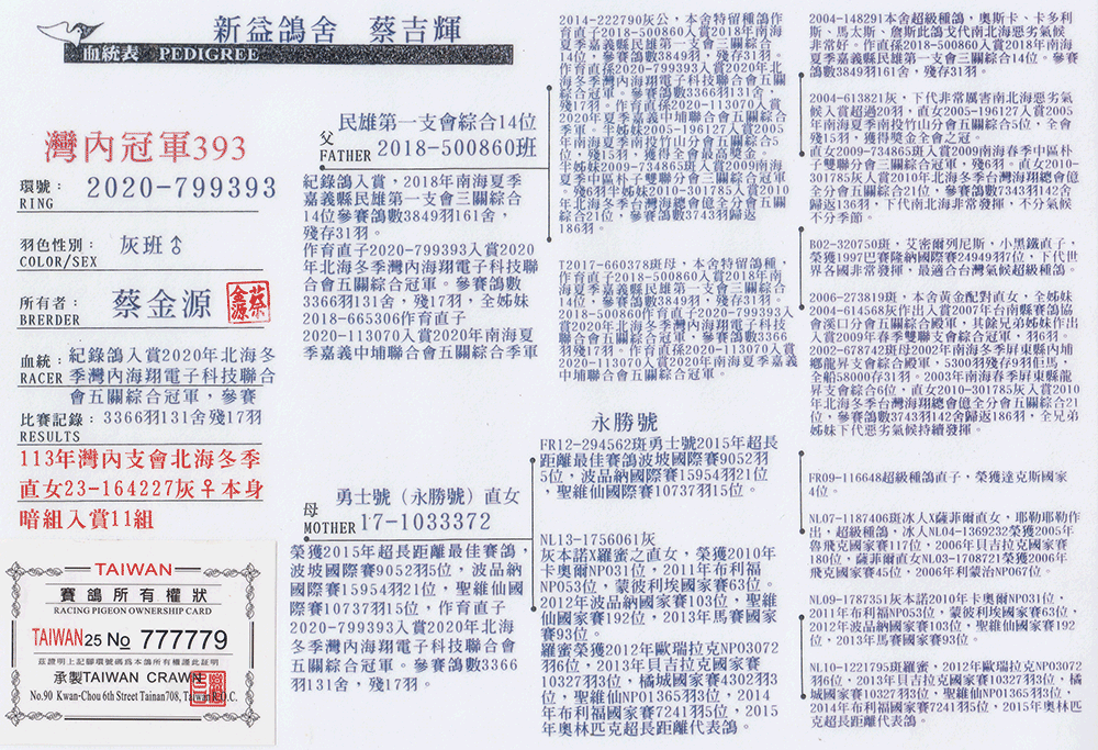 【雙冠王】20年灣內3366羽冬季五關綜合冠軍(殘17羽)X16年春季大台北三關綜合冠軍(殘25羽)全船最高分速;姐鴿桃園大北區春季五關綜合7位(殘13羽)