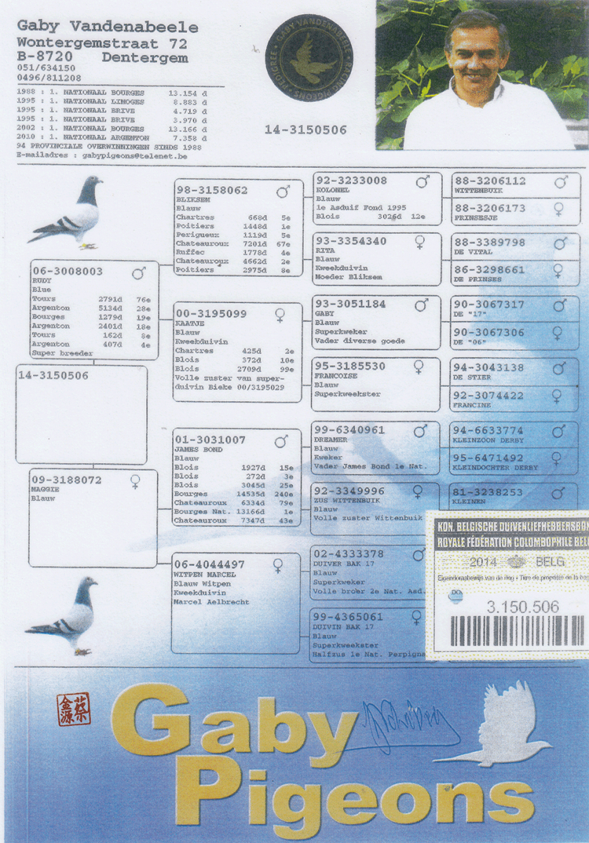 以蓋比血統家族聞名的蔡金源分享,蓋比鴿系的骨架堅硬、健康狀況、種鴿融合度都很好,很適合激烈的台灣海翔。近年如22-254484(灰)冠聖冬季3223羽五關綜合冠軍(全船15位),冠軍鴿之母就是由蔡董作出,血統為超級羅密歐4號(羅密歐直子)X漂亮小姐(魯迪直女)。這羽優秀的蓋比血統冠軍鴿在第一關單關亞軍、第二關單關季軍、第三關單關冠軍、第四關單關季軍,可以說是大殺四方、名不虛傳。可見,蔡金源的蓋比家族經過實戰驗證,無論是近親或是交配他系,都能夠入賞得獎屢創佳績。