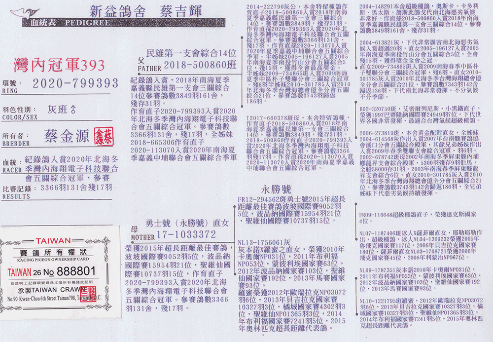 ▲祖父:2018-500860夏季嘉義民雄第一支會3849羽三關綜合14位
