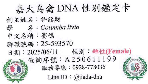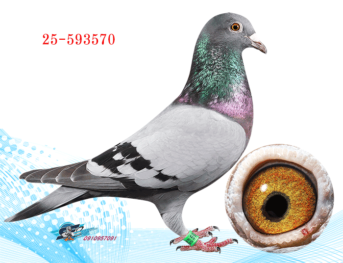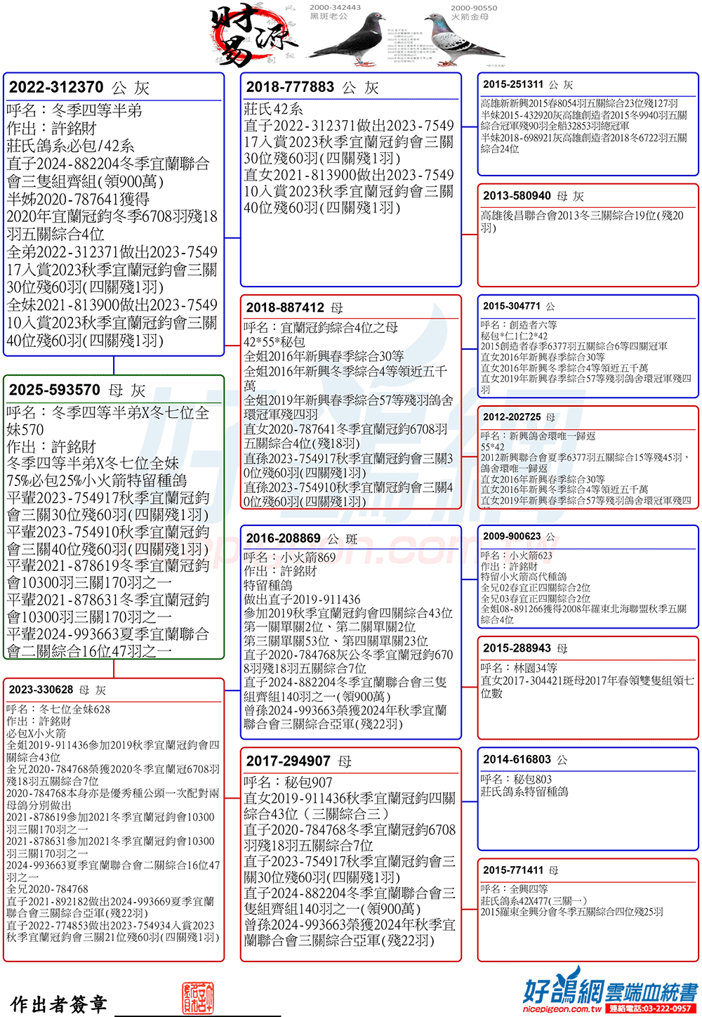 2025年夏季宜蘭聯合會二關綜合8位,環號25-137047灰♂,其父鴿24-993616斑♂,本身入賞夏季三關綜合7位(群益冠軍家族X小火箭三冠家族),母親24-333022,血統為夏季三關綜合亞軍全妹(雙伯馬家族X哈利近親)所作出,許銘財又一次以實戰成績印證了優質血統一脈相承的可貴。