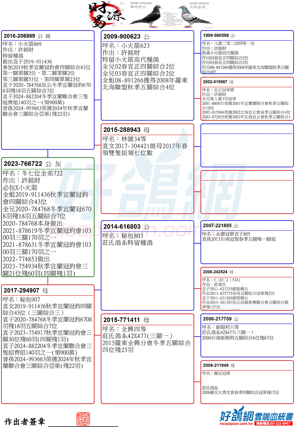 2025年夏季宜蘭聯合會二關綜合8位,環號25-137047灰♂,其父鴿24-993616斑♂,本身入賞夏季三關綜合7位(群益冠軍家族X小火箭三冠家族),母親24-333022,血統為夏季三關綜合亞軍全妹(雙伯馬家族X哈利近親)所作出,許銘財又一次以實戰成績印證了優質血統一脈相承的可貴。