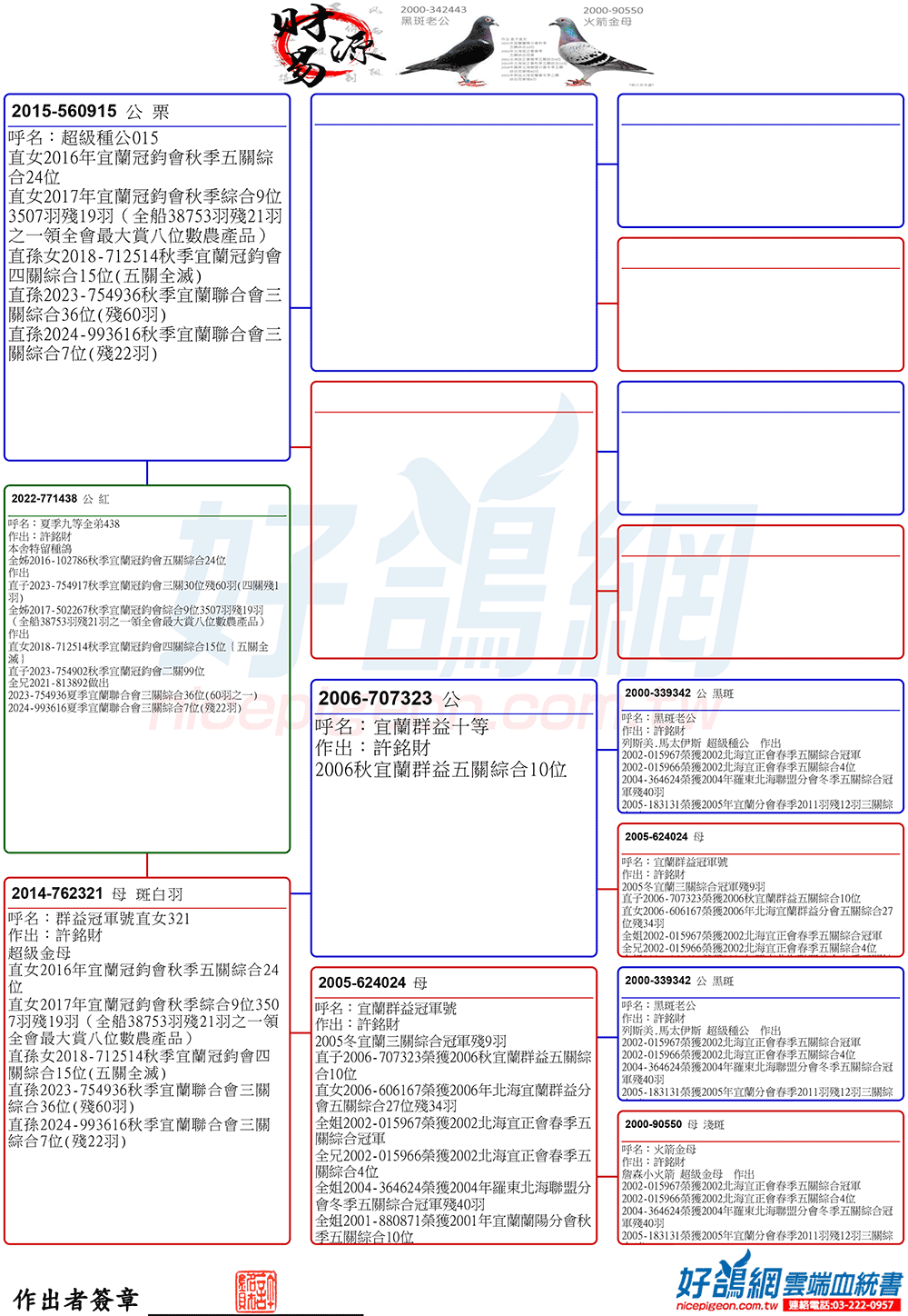 2025年夏季宜蘭聯合會二關綜合8位,環號25-137047灰♂,其父鴿24-993616斑♂,本身入賞夏季三關綜合7位(群益冠軍家族X小火箭三冠家族),母親24-333022,血統為夏季三關綜合亞軍全妹(雙伯馬家族X哈利近親)所作出,許銘財又一次以實戰成績印證了優質血統一脈相承的可貴。