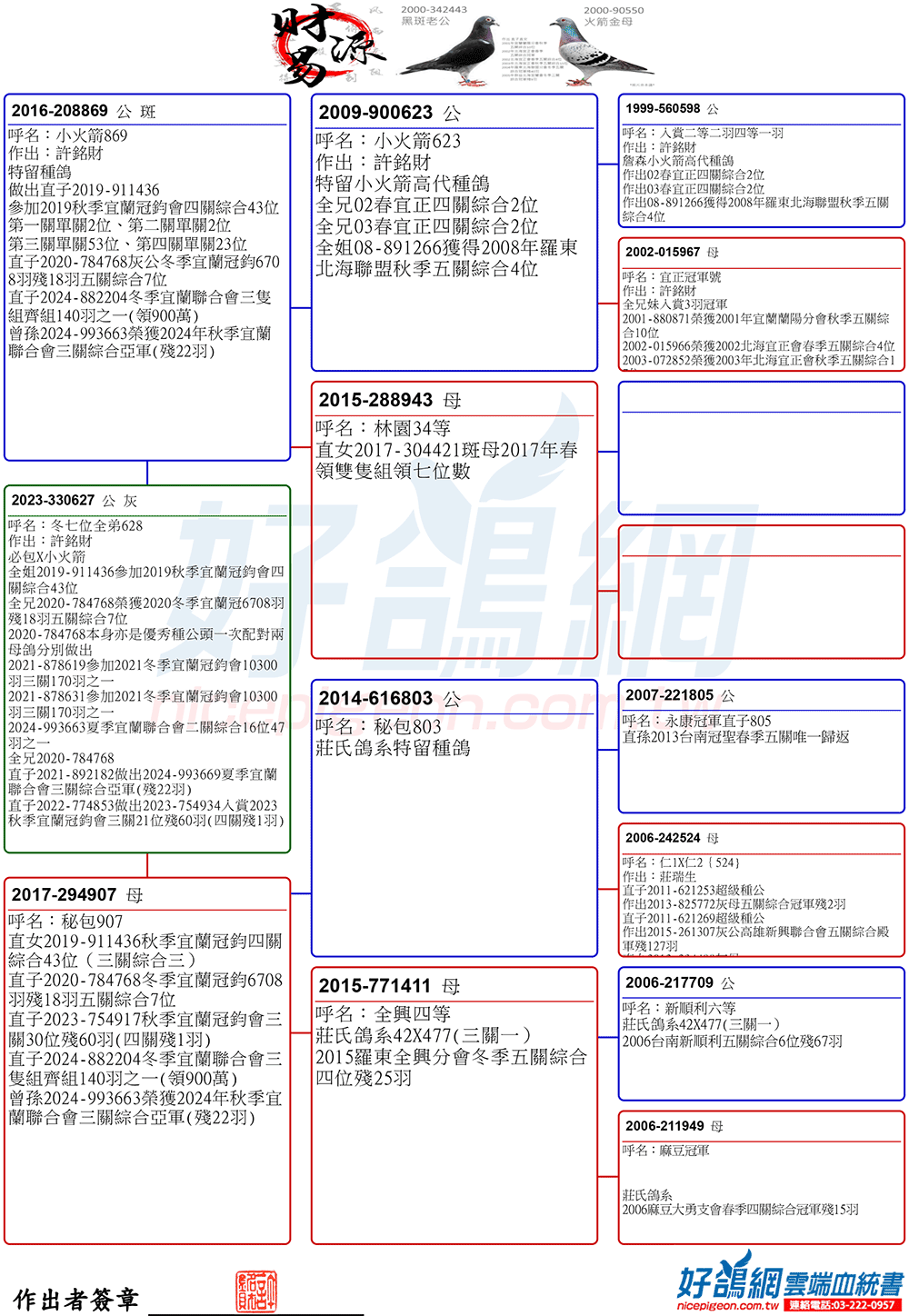 【鴿主推薦】佰萬種公(詹森白羽號)原配對近親家族