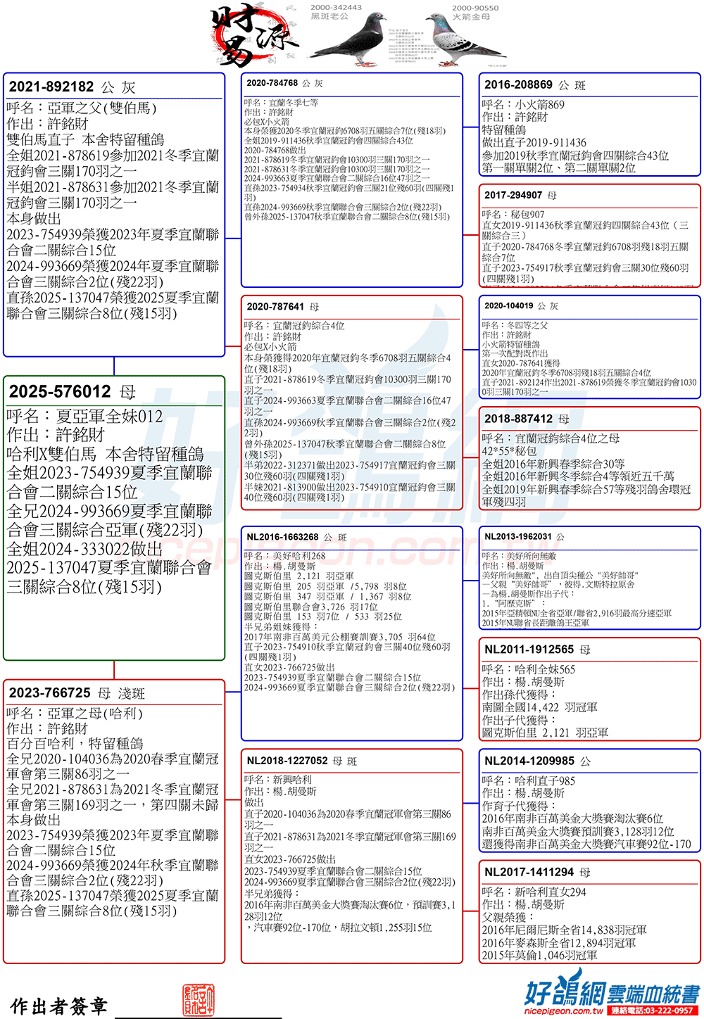 2025年夏季宜蘭聯合會二關綜合8位,環號25-137047灰♂,其父鴿24-993616斑♂,本身入賞夏季三關綜合7位(群益冠軍家族X小火箭三冠家族),母親24-333022,血統為夏季三關綜合亞軍全妹(雙伯馬家族X哈利近親)所作出,許銘財又一次以實戰成績印證了優質血統一脈相承的可貴。
