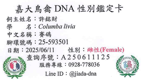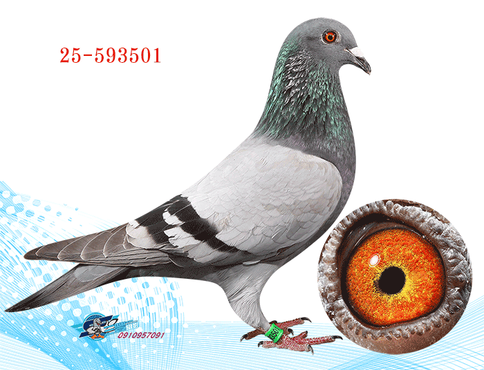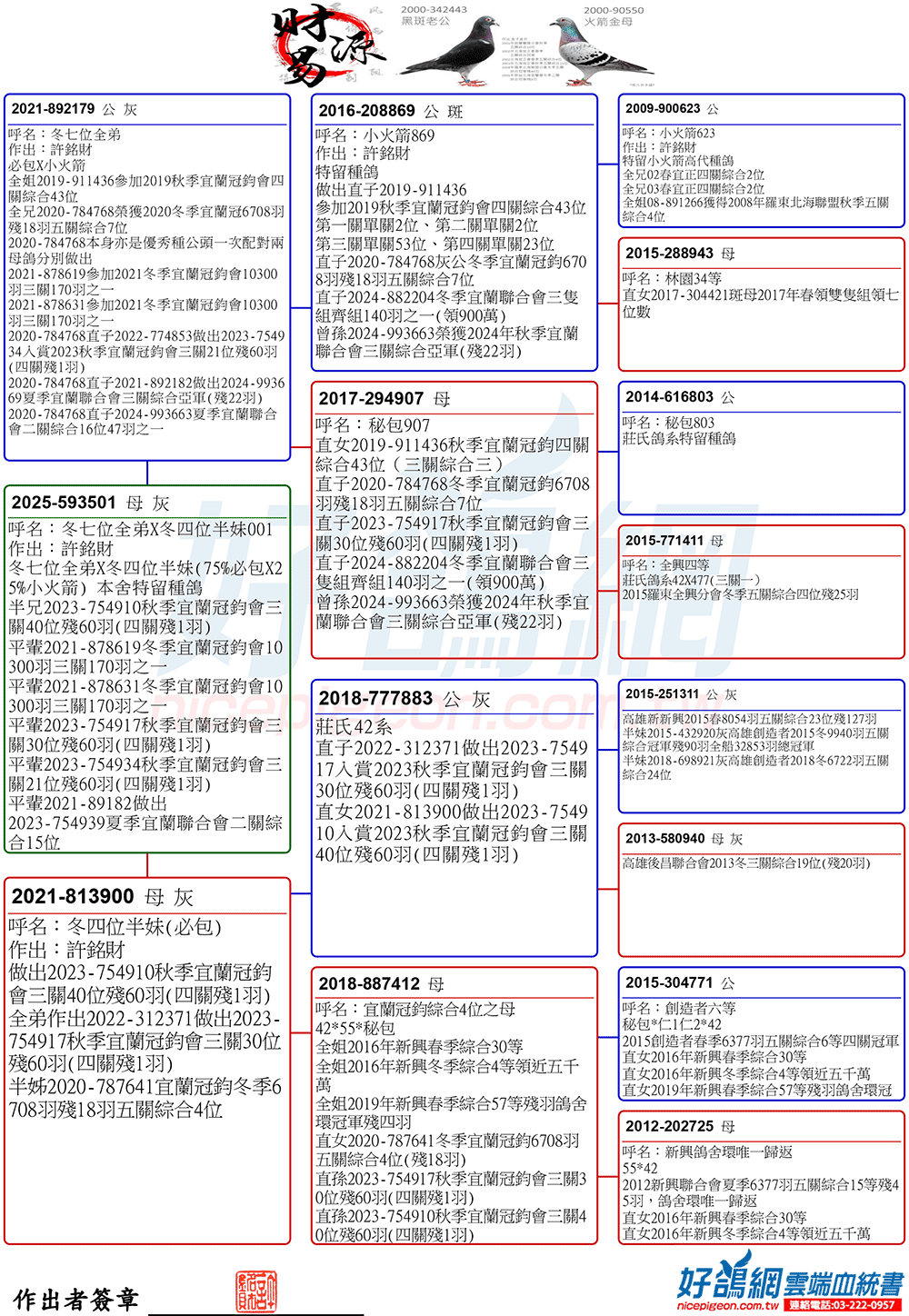 2025年夏季宜蘭聯合會二關綜合8位,環號25-137047灰♂,其父鴿24-993616斑♂,本身入賞夏季三關綜合7位(群益冠軍家族X小火箭三冠家族),母親24-333022,血統為夏季三關綜合亞軍全妹(雙伯馬家族X哈利近親)所作出,許銘財又一次以實戰成績印證了優質血統一脈相承的可貴。