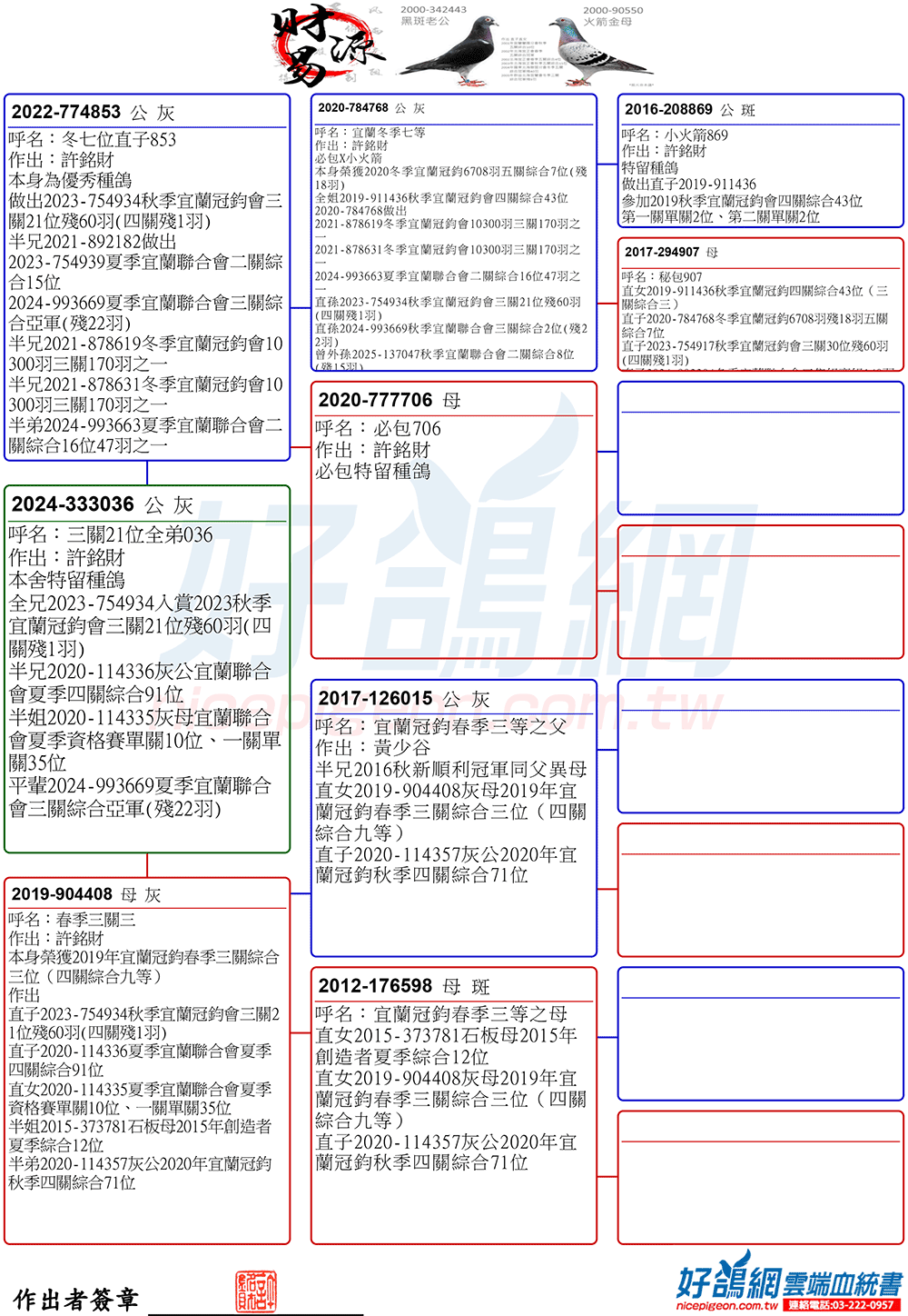2025年夏季宜蘭聯合會二關綜合8位,環號25-137047灰♂,其父鴿24-993616斑♂,本身入賞夏季三關綜合7位(群益冠軍家族X小火箭三冠家族),母親24-333022,血統為夏季三關綜合亞軍全妹(雙伯馬家族X哈利近親)所作出,許銘財又一次以實戰成績印證了優質血統一脈相承的可貴。