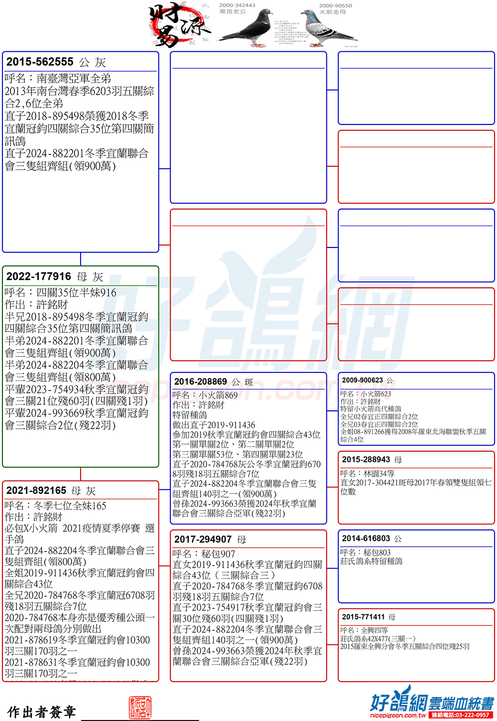 2025年夏季宜蘭聯合會二關綜合8位,環號25-137047灰♂,其父鴿24-993616斑♂,本身入賞夏季三關綜合7位(群益冠軍家族X小火箭三冠家族),母親24-333022,血統為夏季三關綜合亞軍全妹(雙伯馬家族X哈利近親)所作出,許銘財又一次以實戰成績印證了優質血統一脈相承的可貴。