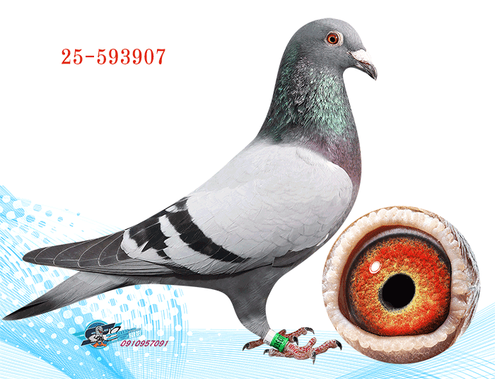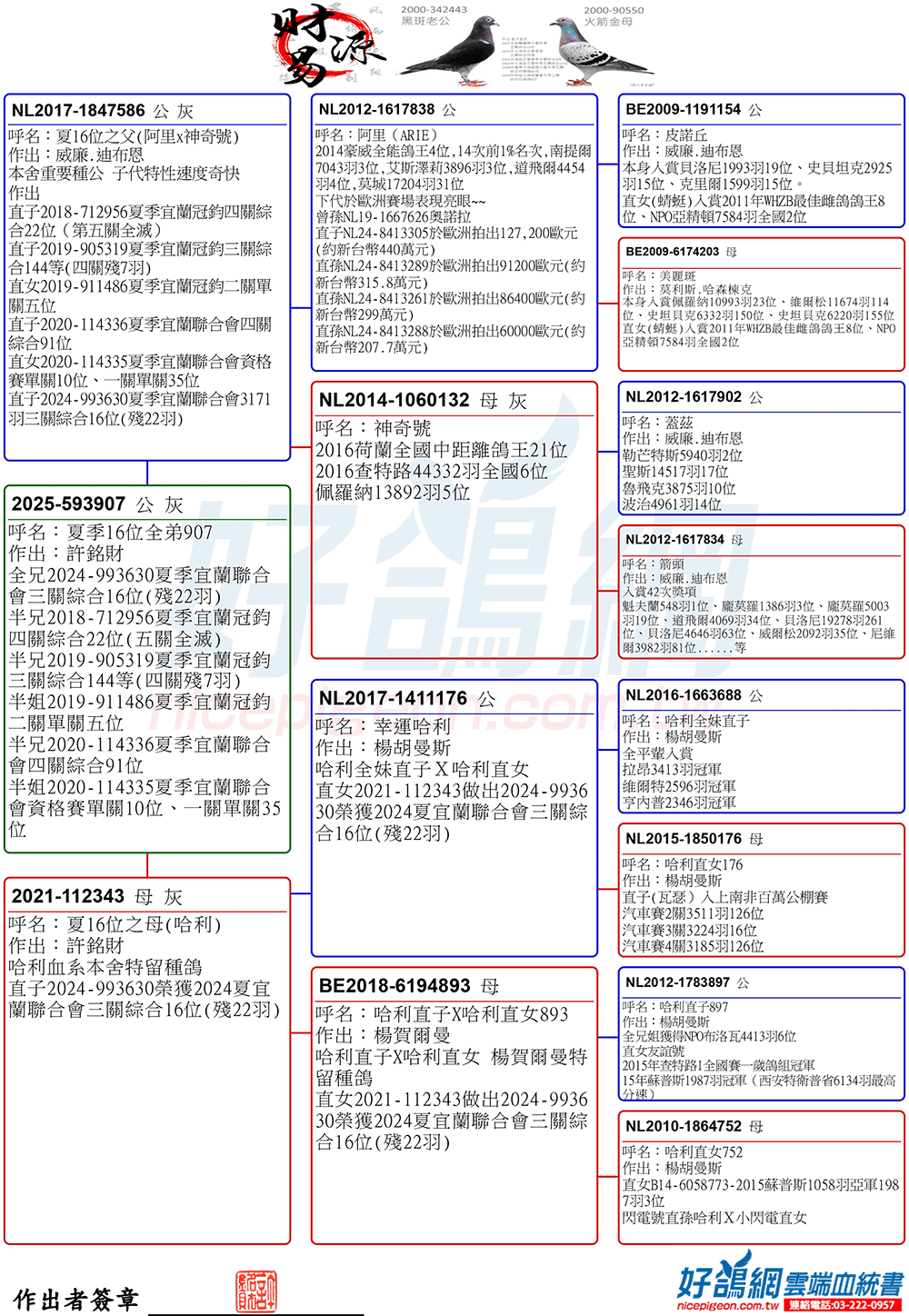2025年夏季宜蘭聯合會二關綜合8位,環號25-137047灰♂,其父鴿24-993616斑♂,本身入賞夏季三關綜合7位(群益冠軍家族X小火箭三冠家族),母親24-333022,血統為夏季三關綜合亞軍全妹(雙伯馬家族X哈利近親)所作出,許銘財又一次以實戰成績印證了優質血統一脈相承的可貴。
