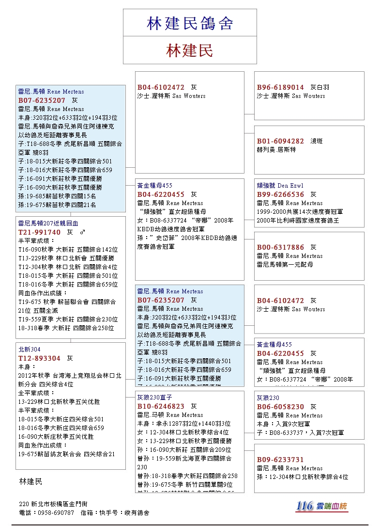 以B07-6235207灰♂為基礎,這位居住在比利時阿連棟克的老將,是一位在幼鴿速度賽的佼佼者,生涯中屢獲比利時KBDB速度鴿王冠軍榮銜的名將,林建民是台灣鴿界最早引進雷尼馬頓鴿系的先驅者之一,此系在燠熱低分速的賽事中常有