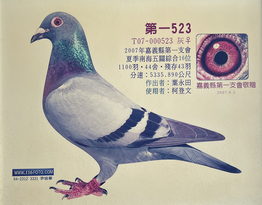 ▲外曾祖母:2007-000523夏季嘉義第一支會1100羽五關綜合16位