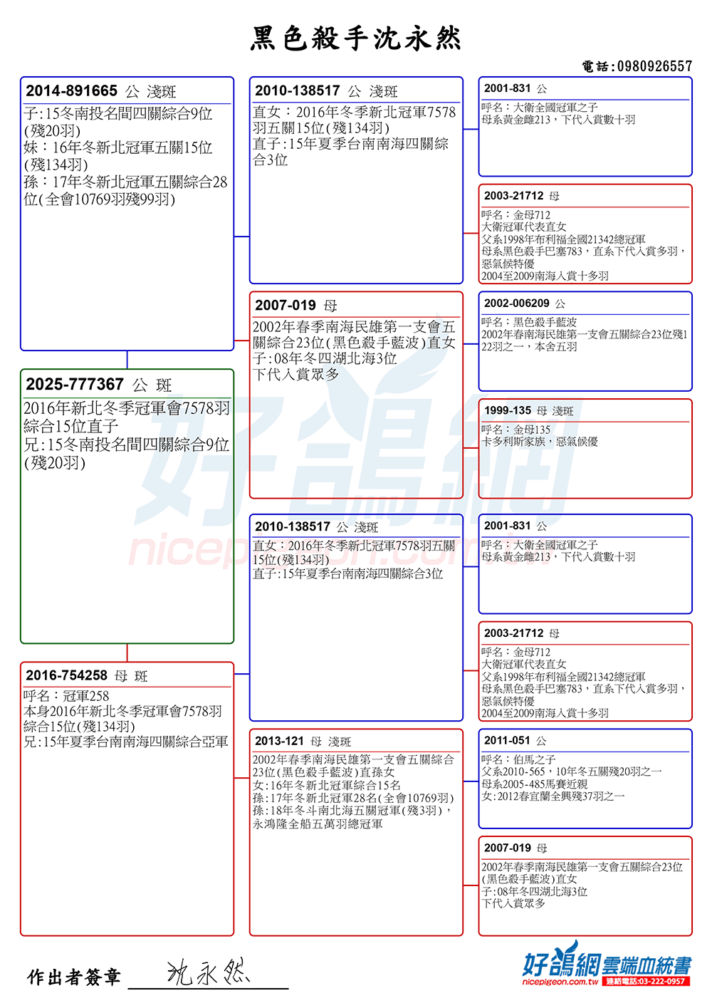 新北冠軍分會冬季7578羽殘134羽五關綜合15位直子(金母712直孫X直孫女近親作出)