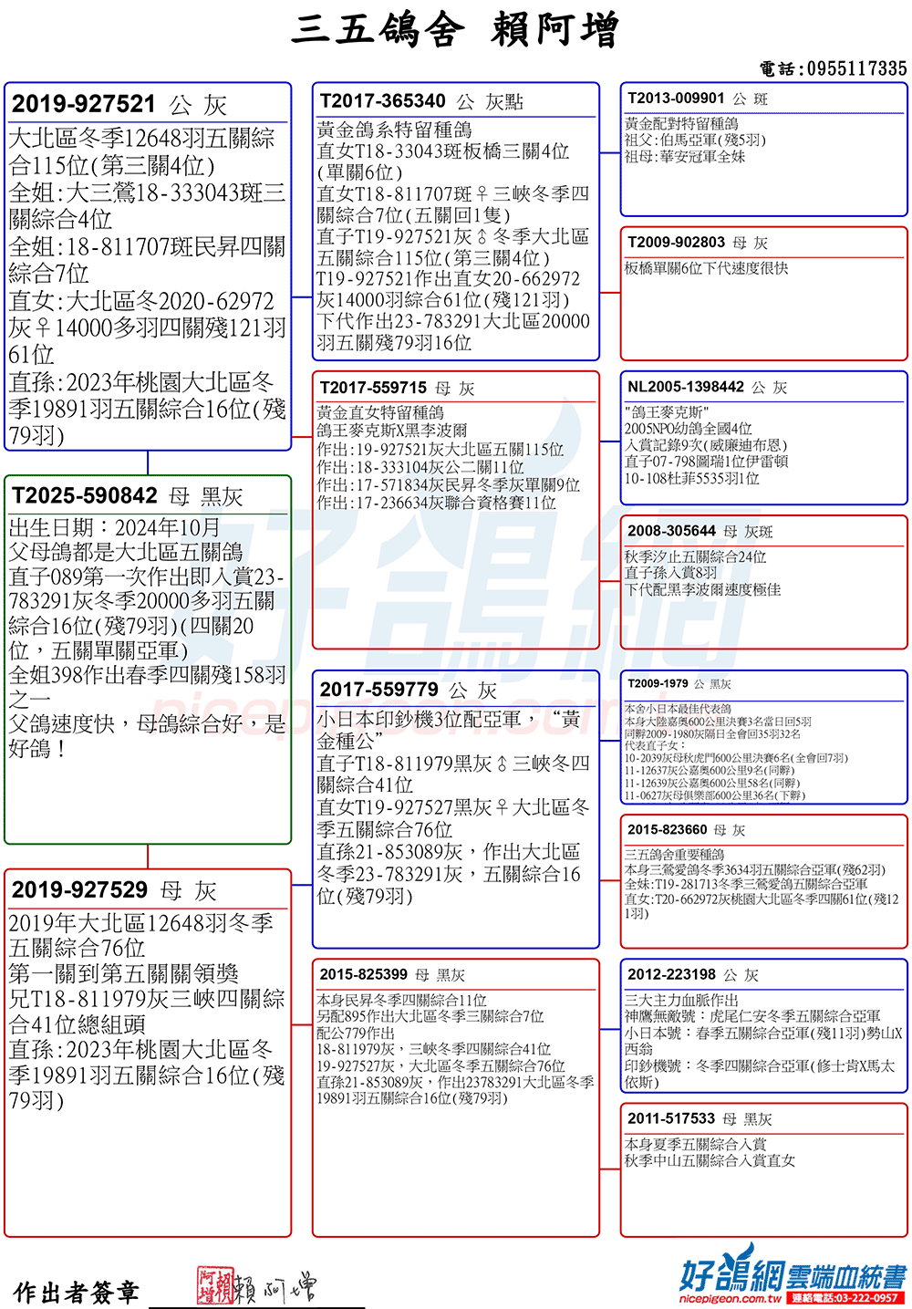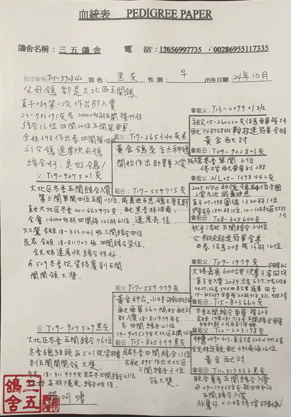 (2)超級種母T83-29914 斑♀"印鈔機",本身入賞72年冬季四關綜合亞軍,印鈔機總共與7羽公鴿配對,每羽的配對直子都得到冠軍,其直系下代翔完五關也超過百羽以上。