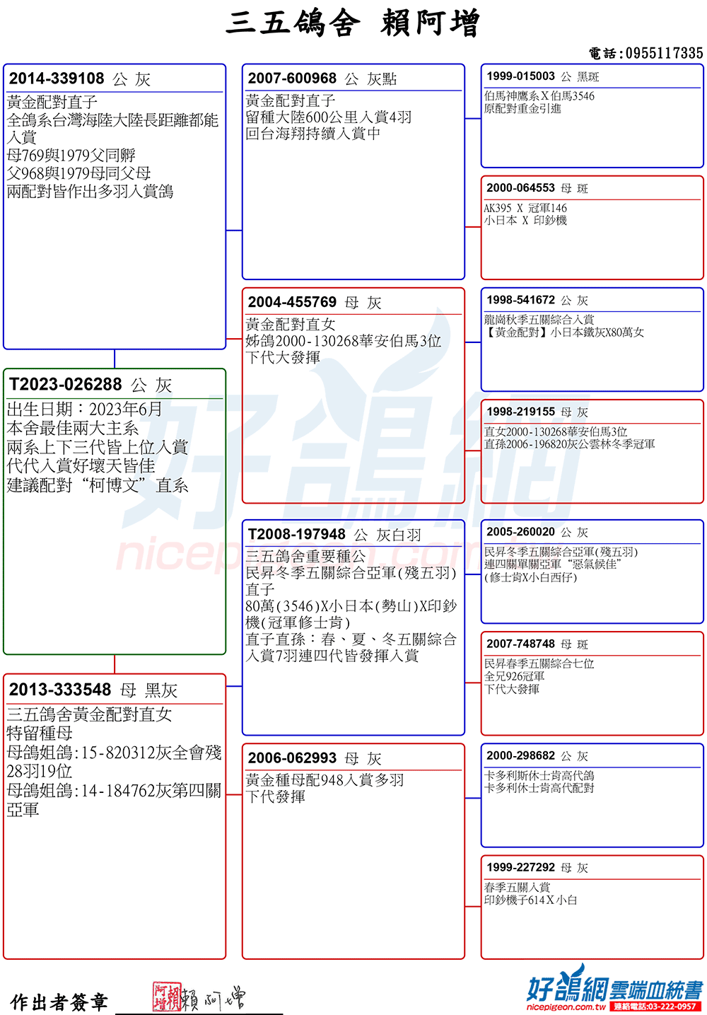(黃金王子X新金姆)直孫X帽子戲法(波治全國60059羽總冠軍)近親母