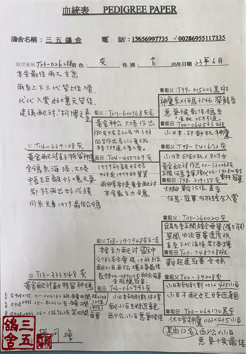 (3)"伯馬阿密魯" 633"T88-29633斑♂。本身入賞72年冬季五關綜合亞軍(全會殘3羽、獨佔2羽),其直子、女也入賞13羽之多,直系下代入賞綜合成績眾多,也都遺傳適應台灣獨特惡劣氣候的特性及本身的歸巢韌性及綜合性。