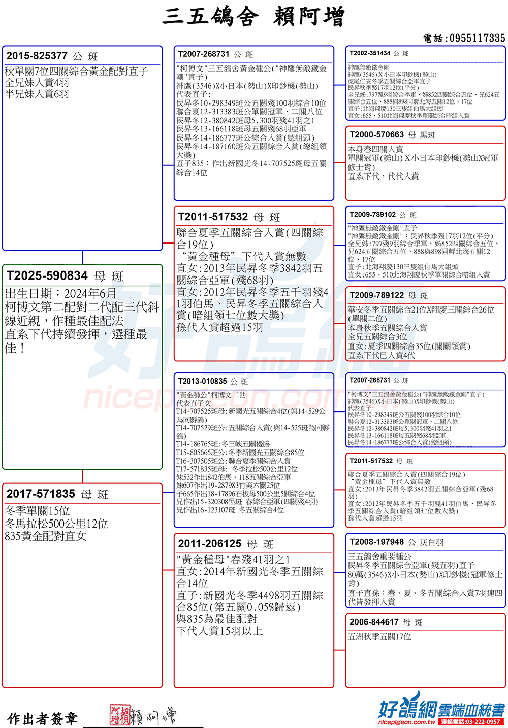 三五鴿舍賴阿增憑藉著已適應台灣氣候又易於融合的本土鴿系,以這四大支柱為基礎,四大鴿系彼此融合性強,兼具速度及適應惡劣氣候的特性,多年來不混入另外的鴿系以自己的紀錄鴿配紀錄鴿,實戰紀錄加上彼此融合的血系早已自成一格,三五鴿系才得以不斷創造佳績的。