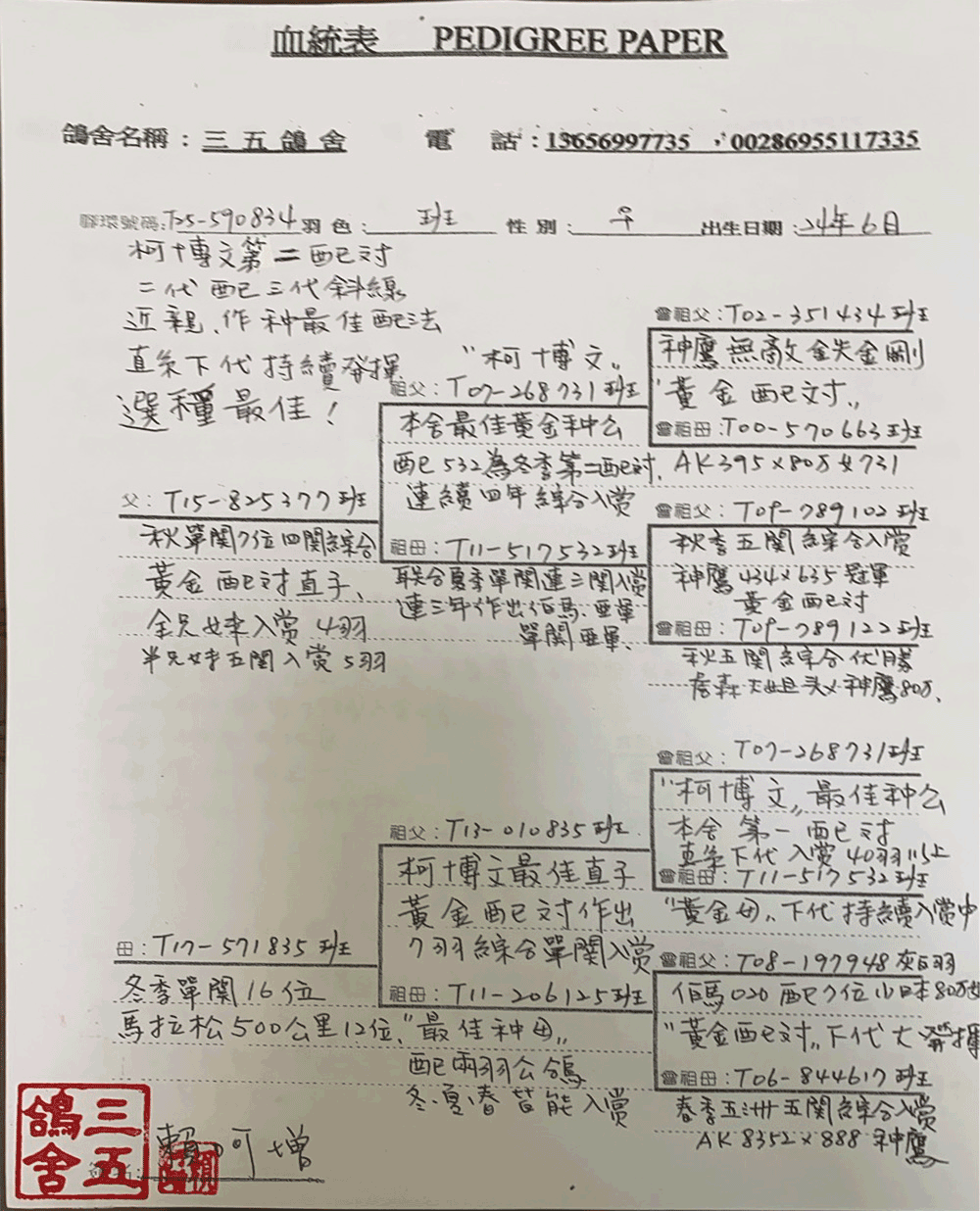 (2)超級種母T83-29914 斑♀"印鈔機",本身入賞72年冬季四關綜合亞軍,印鈔機總共與7羽公鴿配對,每羽的配對直子都得到冠軍,其直系下代翔完五關也超過百羽以上。
