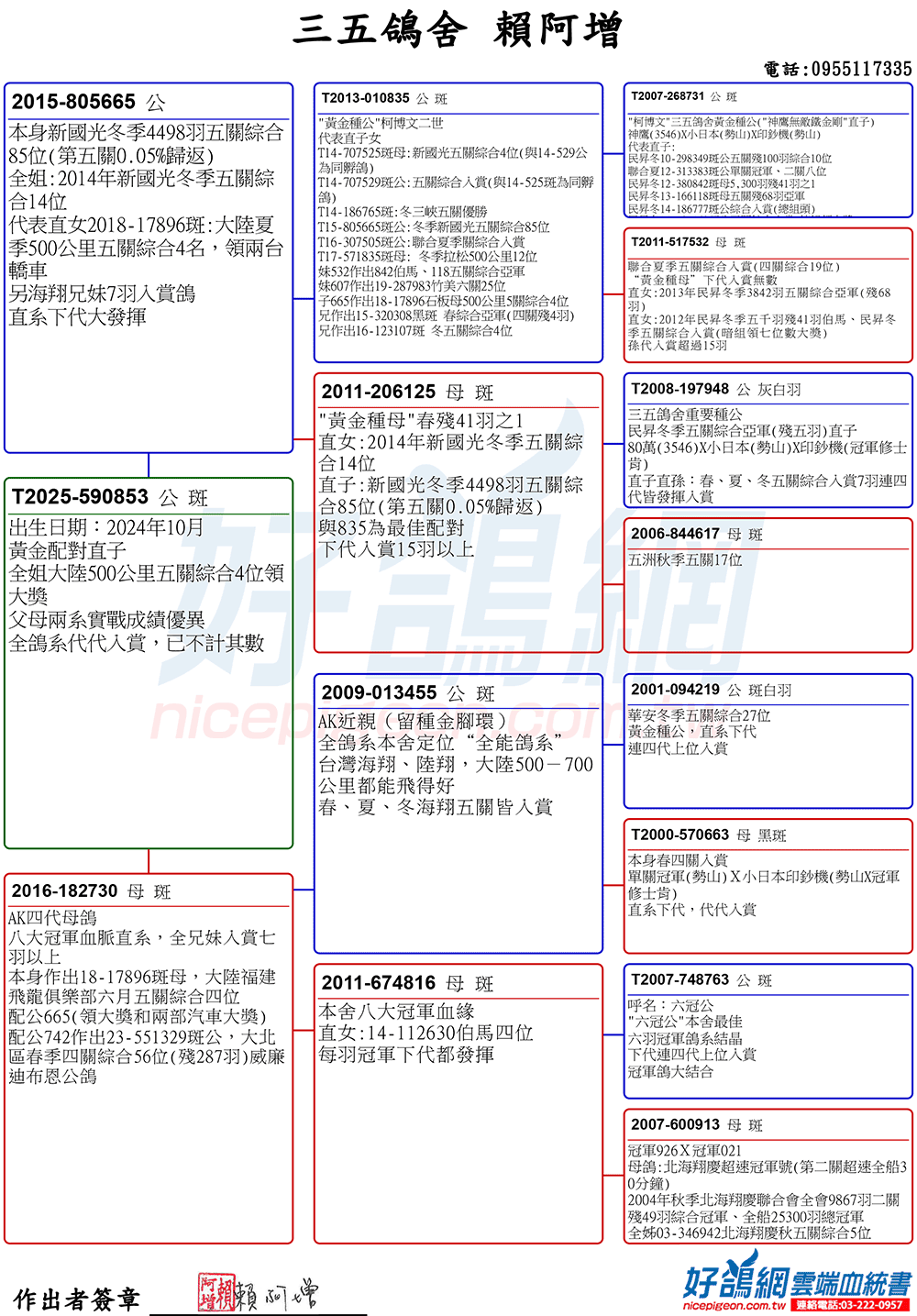 (2)超級種母T83-29914 斑♀"印鈔機",本身入賞72年冬季四關綜合亞軍,印鈔機總共與7羽公鴿配對,每羽的配對直子都得到冠軍,其直系下代翔完五關也超過百羽以上。