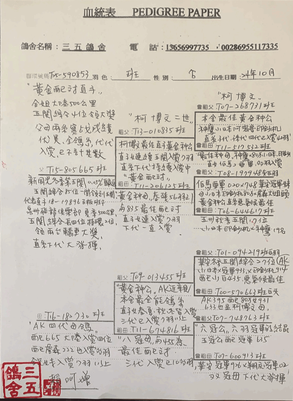 (3)"伯馬阿密魯" 633"T88-29633斑♂。本身入賞72年冬季五關綜合亞軍(全會殘3羽、獨佔2羽),其直子、女也入賞13羽之多,直系下代入賞綜合成績眾多,也都遺傳適應台灣獨特惡劣氣候的特性及本身的歸巢韌性及綜合性。