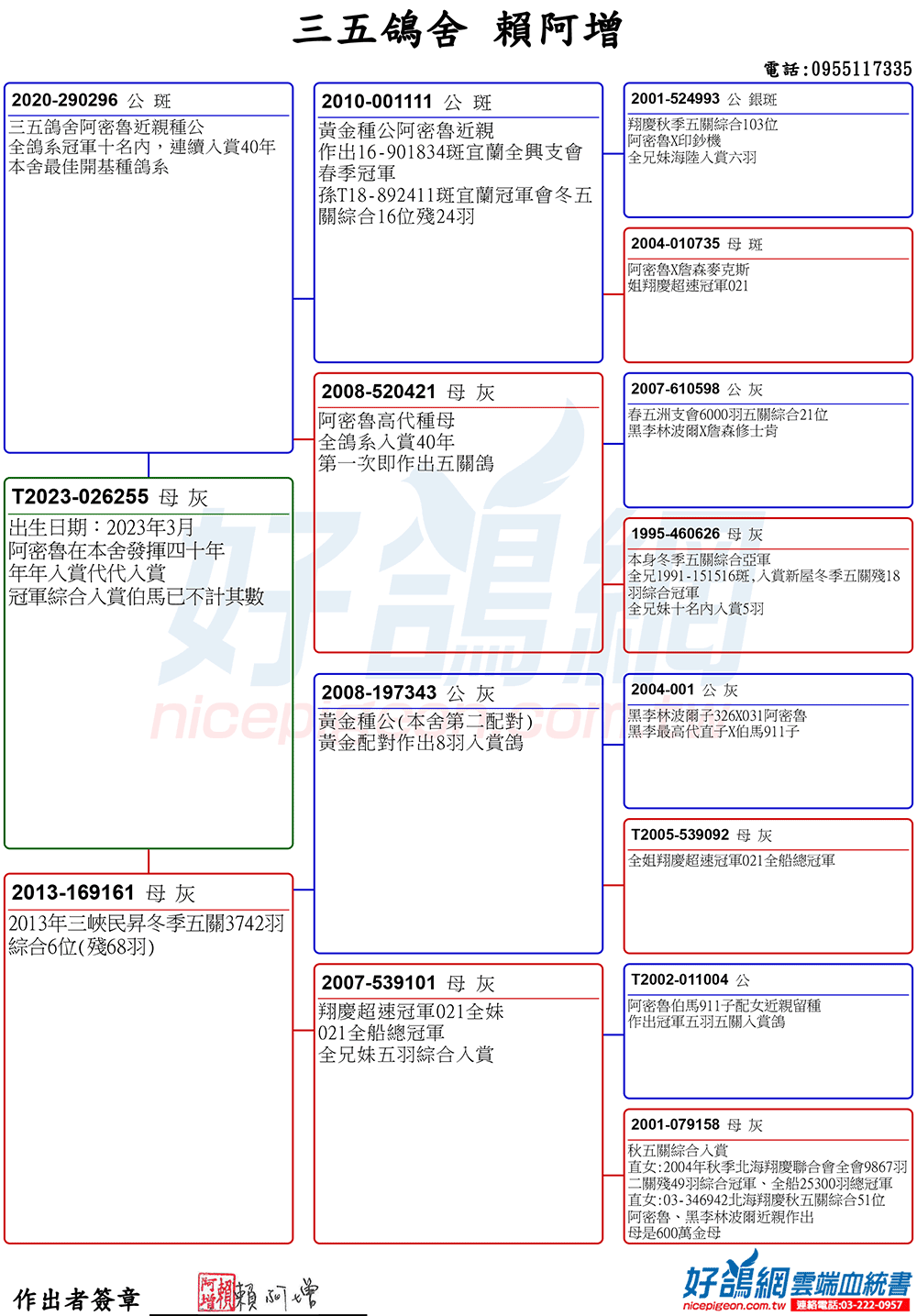 三五鴿舍賴阿增憑藉著已適應台灣氣候又易於融合的本土鴿系,以這四大支柱為基礎,四大鴿系彼此融合性強,兼具速度及適應惡劣氣候的特性,多年來不混入另外的鴿系以自己的紀錄鴿配紀錄鴿,實戰紀錄加上彼此融合的血系早已自成一格,三五鴿系才得以不斷創造佳績的。