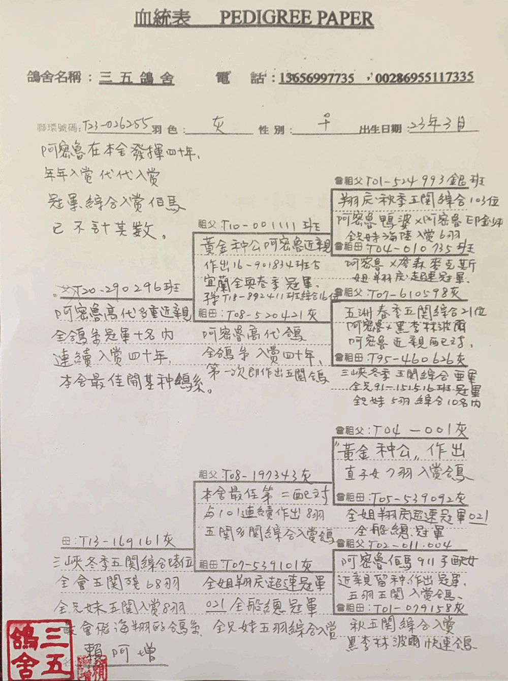 三五鴿舍阿密魯近親種公X三峽民昇冬季五關綜合6位