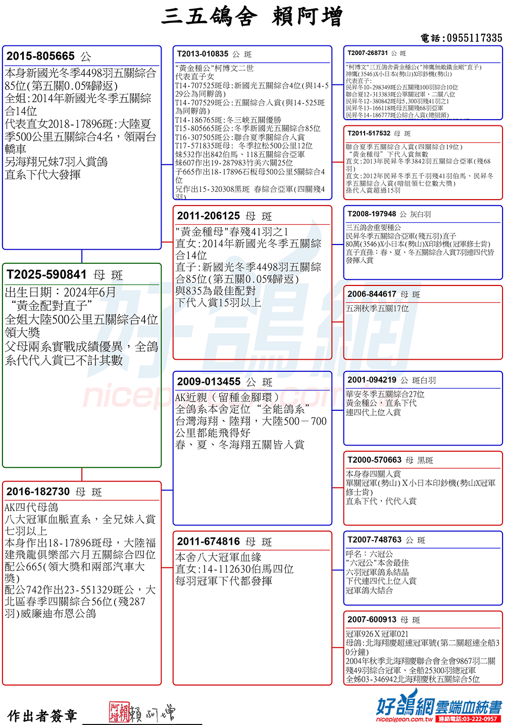 三五鴿舍賴阿增憑藉著已適應台灣氣候又易於融合的本土鴿系,以這四大支柱為基礎,四大鴿系彼此融合性強,兼具速度及適應惡劣氣候的特性,多年來不混入另外的鴿系以自己的紀錄鴿配紀錄鴿,實戰紀錄加上彼此融合的血系早已自成一格,三五鴿系才得以不斷創造佳績的。