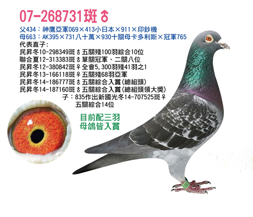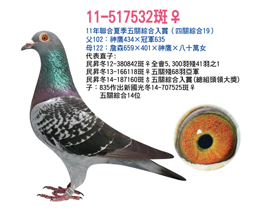 (2)超級種母T83-29914 斑♀"印鈔機",本身入賞72年冬季四關綜合亞軍,印鈔機總共與7羽公鴿配對,每羽的配對直子都得到冠軍,其直系下代翔完五關也超過百羽以上。