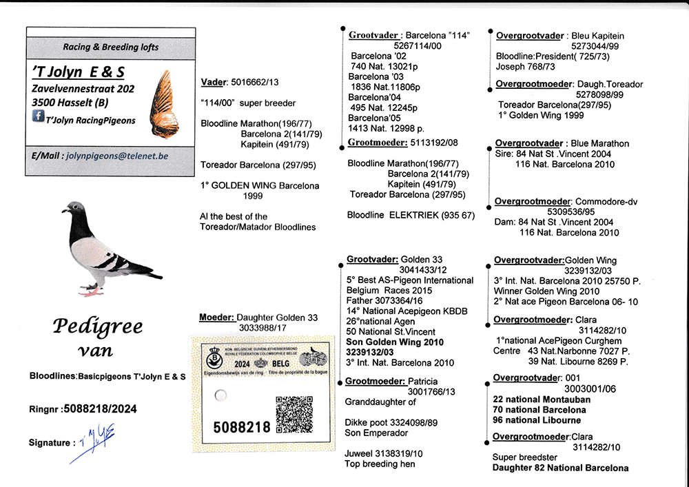 比利時裘林兄弟「T'JOLYN-PIGEONS」鴿舍30年來致力於培育最好的100%近親血統。T'Jolyn 鴿舍的基礎種鴿的後代為:「巴塞隆納鬥牛士」、「巴塞隆納桂冠鴿」、「超級金」、「巴塞隆納冠軍」、「馬拉松冠軍」、「未來最好的」等經典的鴿系!