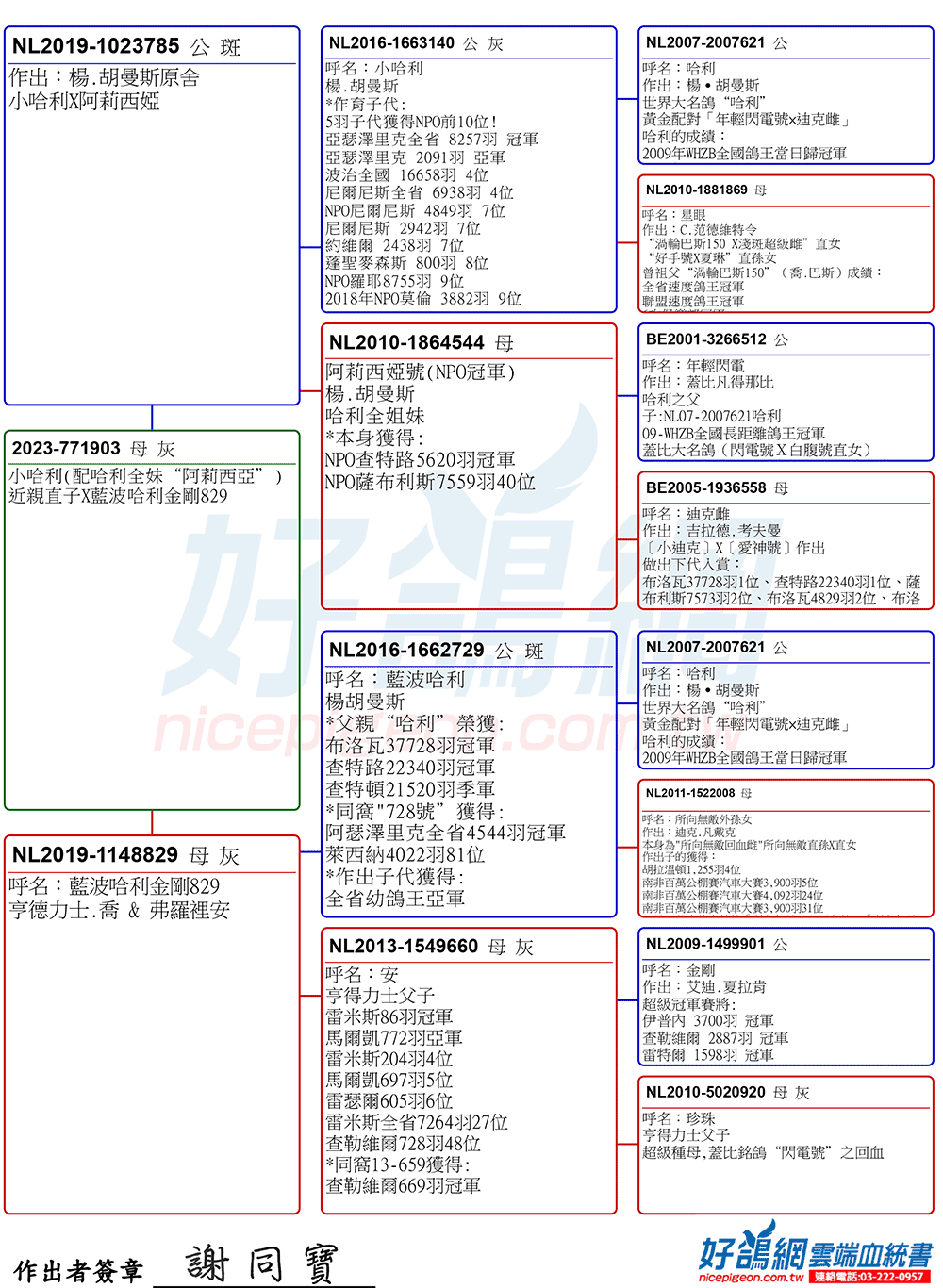 「哈利」,環號NL07-2007621,荷蘭名家楊•胡曼斯的超級賽鴿,荷蘭賽鴿史上最優秀的神奇賽將!「哈利」掀起的風潮可以說是當代鴿壇最優秀的超級鴿之一。